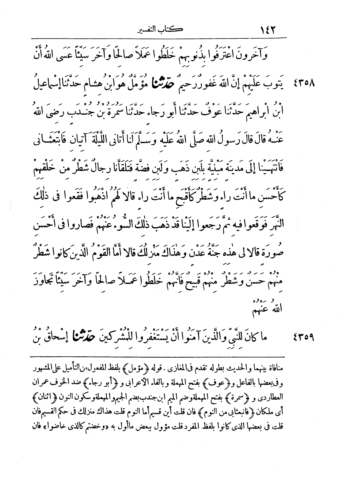 منافاة بينهما والحديث بطوله تقدم في المغازي. قوله (مؤمل) بلفظ المفعول من التأميل على المشهور وفي بعضها بالفاعل و (عوف) بفتح المهملة وبالفاء الأعرابي و (أبو رجاء) ضد الخوف عمران العطاردي و (سمرة) بفتح المهملة وضم الميم ابن جندب بضم الجيم والمهملة وسكون النون (اثنان) أي ملكان (فانبعثا بي من النوم) إن قلت أين قسيم أما النوم قلت هذاك منزلك في حكم القسيم فإن قلت في بعضها الذي كانوا بلفظ المفرد قلت مؤول ببعض ما أول به "وخضتم كالذي خاضوا" فإن