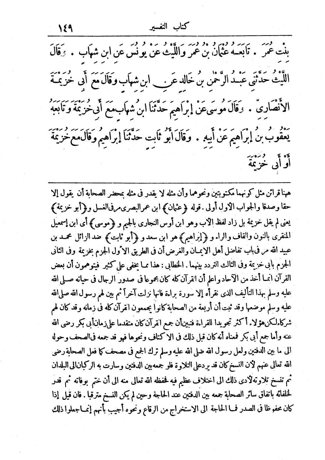 تَابَعَهُ عُثْمَانُ بْنُ عُمَرَ وَاللَّيْثُ عَنْ يُونُسَ عَنْ ابْنِ شِهَابٍ وَقَالَ اللَّيْثُ حَدَّثَنِي عَبْدُ الرَّحْمَنِ بْنُ خَالِدٍ عَنْ ابْنِ شِهَابٍ وَقَالَ مَعَ أَبِي خُزَيْمَةَ الْأَنْصَارِيِّ وَقَالَ مُوسَى عَنْ إِبْرَاهِيمَ حَدَّثَنَا ابْنُ شِهَابٍ مَعَ أَبِي خُزَيْمَةَ وَتَابَعَهُ يَعْقُوبُ بْنُ إِبْرَاهِيمَ عَنْ أَبِيهِ وَقَالَ أَبُو ثَابِتٍ حَدَّثَنَا إِبْرَاهِيمُ وَقَالَ مَعَ خُزَيْمَةَ أَوْ أَبِي خُزَيْمَةَ