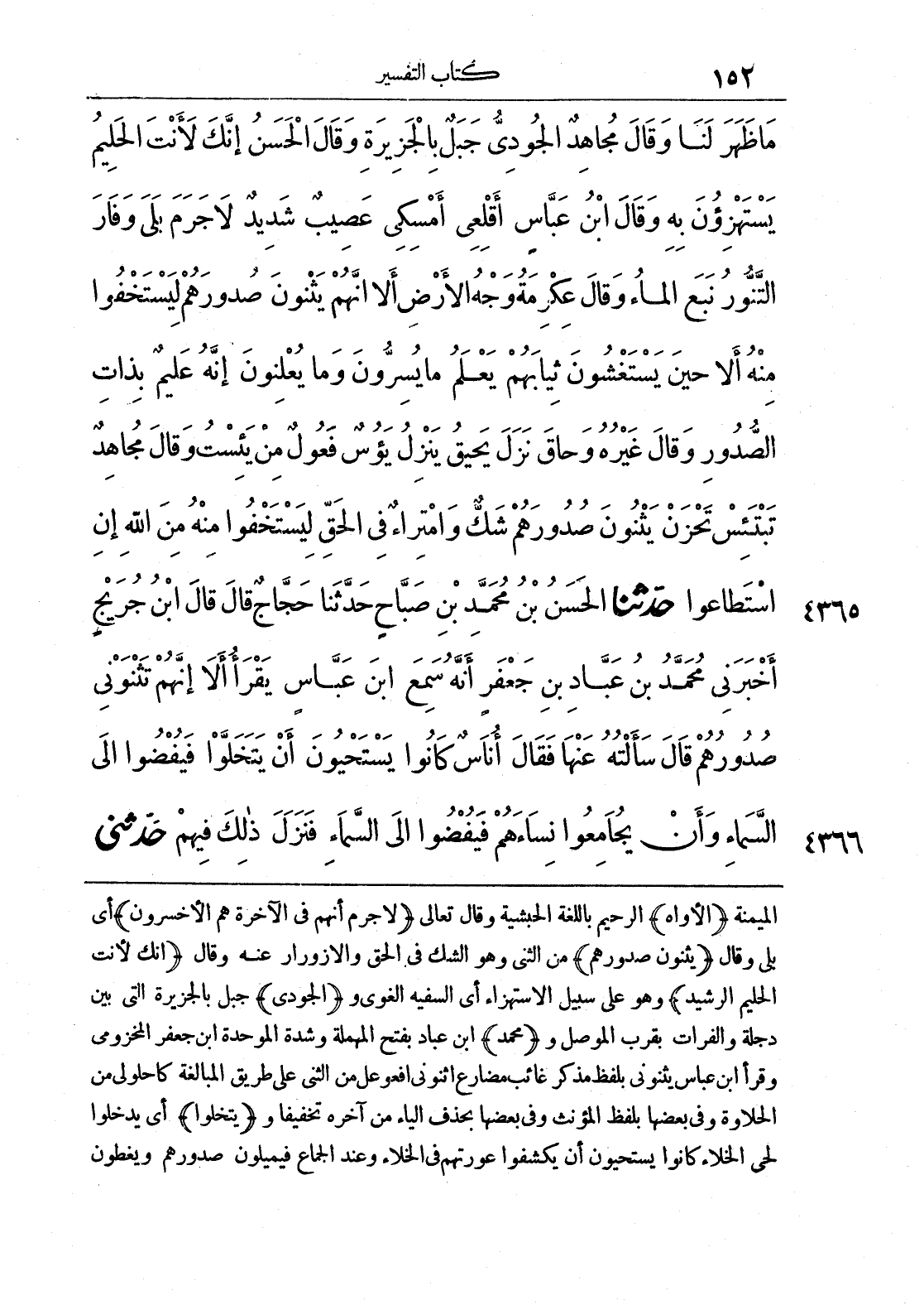 الميمنة (الأواه) الرحيم باللغة الحبشية وقال تعالى (لا جرم أنهم في الآخرة هم الأخسرون) أي بلى وقال (يثنون صدورهم) من الثني وهو الشك في الحق والأزورار عنه وقال (أنك لأنت الحليم الرشيد) وهو على سبيل الاستهزاء أي السفيه الغوي و (الجودي) جبل بالجزيرة التي بين دجلة والفرات بقرب الموصل و (محمد) ابن عباد بفتح المهملة وشدة الموحدة ابن جعفر المخزومي وقرأ ابن عباس يثنوني بلفظ مذكر غائب مضارع اثنوني افعوعل من الثني على طريق المبالغة كاحلولي من الحلاوة وفي بعضها بلفظ المؤنث وفي بعضها بحذف الياء من آخره تخفيفا و (يتخلوا) أي يدخلوا لحى الخلاء كانوا يستحيون أن يكشفوا عورتهم في الخلاء وعند الجماع يميلون صدورهم ويغطون