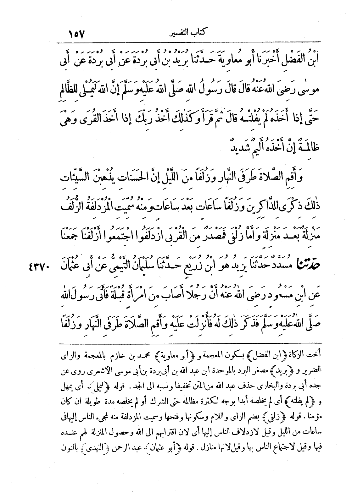 أخت الزكاة (ابن الفضل) بسكون المعجمة و (أبو معاوية) محمد بن خازم بالمعجمة والزاي الضرير و (بريد) مصغر البرد بالموحدة ابن عبد الله بن أبي بردة بن أبي موسى الأشعري روى عن جده أبي بردة والبخاري حذف عبد الله من المتن تخفيفا ونسبة إلى الجد. قوله (ليملي) أي يمهل و (لم يفلته) أي لم يخلصه أبدا بوجه لكثرة مظالمه حتى الشرك أو لم يخلصه مدة طويلة أن كان مؤمنا. قوله (زلفى) بضم الزاي واللام وسكونها وفتحها وسميت المزدلفة منه لمجيء الناس إليها في ساعات من الليل وقيل لازدلاف الناس إليها أي لأن اقترابهم إلى الله وحصول المنزلة لهم عنده فيها لاجتماع الناس بها وقيل منازل. قوله (أبو عثمان) عبد الرحمن (النهدي) بالنون