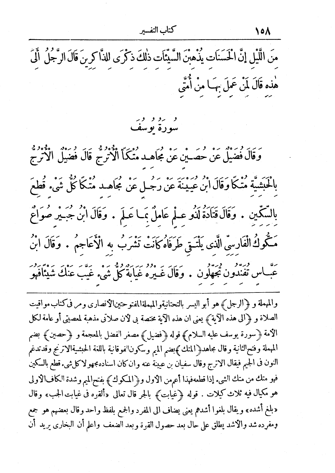 والمهملة و (الرجل) هو أبو اليسر بالتحتانية والمهملة المفتوحتين الأنصاري ومر في كتاب مواقيت الصلاة و (إلى هذه الآية) يعني أن هذه الآية مختصة لي لأن صلاتي مذهبة لمعصيتي أو عامة لكل الأمة (سورة يوسف عليه السلام) قوله (فضيل) مصغر الفضل بالمعجمة و (حصين) بضم المهملة وفتح الثانية وقال مجاهد (المتك) بضم الميم وسكون الفوقانية باللغة الحبشية الأترنج وقد تدغم النون في الجيم يقال الأترج وقال سفيان بن عيينة عنه وإن كان إسناده مجهولا كل شيء قطع بالسكين فهو متك من متك الشيء إذا قطعه فهذا أعم من الأول و (المكوك) بفتح الميم وشدة الكاف الأولى هو مكيال فيه ثلاث كيلات. قوله (غيابت) بالجر قال تعالى "ألقوه في غيابت الجب" وقال "بلغ أشده" ويقال بلغوا أشدهم يعني يضاف إلى المفرد والجمع بلفظ واحد وقال بعضهم هو جمع ومفرده شد والأشد يطلق على حال بعد حصول القوة وبعد الضعف واعلم أن البخاري يريد أن
