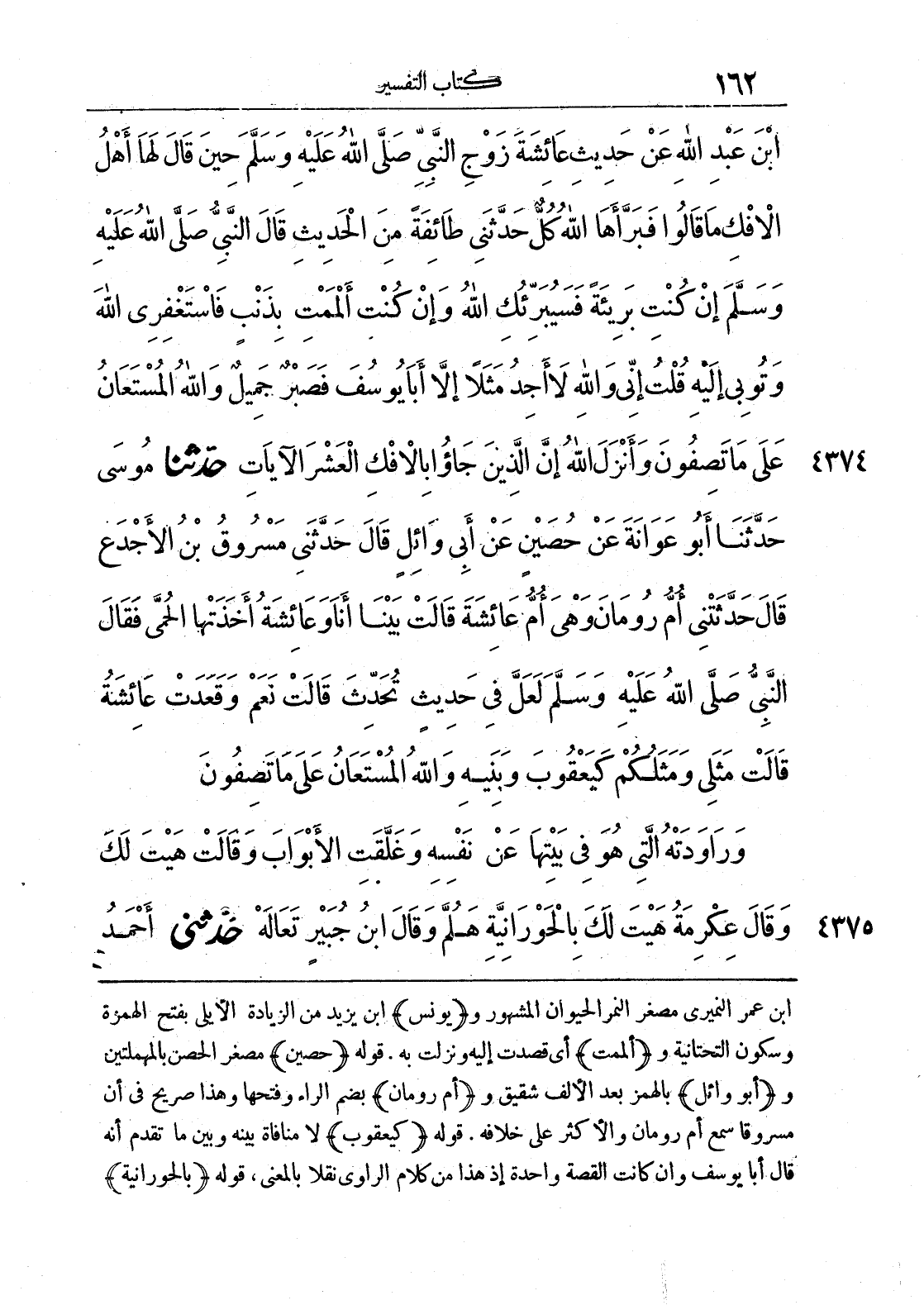ابن عمير النميري مصغر النمر الحيوان المشهور و (يونس) اين يزيد من الزيادة الأيلي بفتح الهمزة وسكون التحتانية و (ألمت) أي قصدت إليه ونزلت به. قوله (حصين) مصغر الحصن بالمهملتين و (أبو وائل) بالهمز بعد الألف شقيق و (أم رومان) بضم الراء وفتحها وهذا صريح في أن مسروقا سمع أم رومان والأكثر على خلافه. قوله (كيعقوب) لا منافاة بينه وبين ما تقدم أنه قال أبا يوسف وإن كانت القصة واحدة إذ هذا من كلام الراوي نقلا بالمعنى، قوله (بالحورانية)