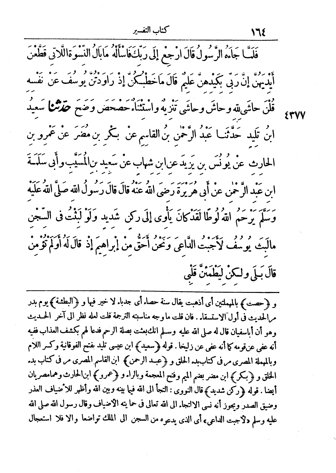 بَاب قَوْلِهِ {فَلَمَّا جَاءَهُ الرَّسُولُ قَالَ ارْجِعْ إِلَى رَبِّكَ فَاسْأَلْهُ مَا بَالُ النِّسْوَةِ اللَّاتِي قَطَّعْنَ أَيْدِيَهُنَّ إِنَّ رَبِّي بِكَيْدِهِنَّ عَلِيمٌ قَالَ مَا خَطْبُكُنَّ إِذْ رَاوَدْتُنَّ يُوسُفَ عَنْ نَفْسِهِ قُلْنَ حَاشَى لِلَّهِ}