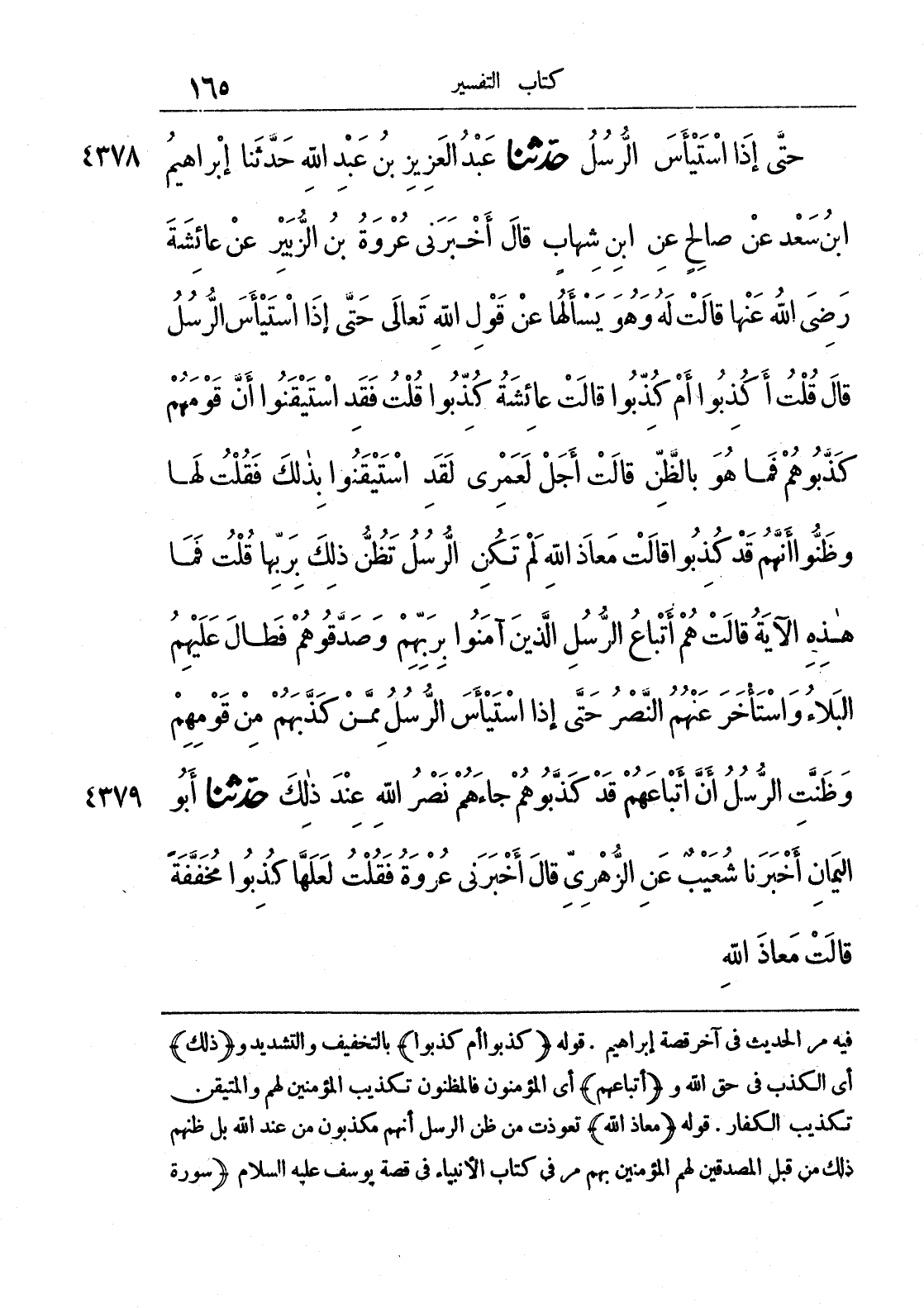 4378 - حدثنا عبد العزيز بن عبد الله حدثنا إبراهيم بن سعد عن صالح عن ابن شهاب قال أخبرني عروة بن الزبير عن عائشة رضي الله عنها قالت له وهو يسألها عن قول الله تعالى حتى إذا استيأس قَالَ قُلْتُ أَكُذِبُوا أَمْ كُذِّبُوا قَالَتْ عَائِشَةُ كُذِّبُوا قُلْتُ فَقَدْ اسْتَيْقَنُوا أَنَّ قَوْمَهُمْ كَذَّبُوهُمْ فَمَا هُوَ بِالظَّنِّ قَالَتْ أَجَلْ لَعَمْرِي لَقَدْ اسْتَيْقَنُوا بِذَلِكَ فَقُلْتُ لَهَا وَظَنُّوا أَنَّهُمْ قَدْ كُذِبُوا قَالَتْ مَعَاذَ اللَّهِ لَمْ تَكُنْ الرُّسُلُ تَظُنُّ ذَلِكَ بِرَبِّهَا قُلْتُ فَمَا هَذِهِ الْآيَةُ قَالَتْ هُمْ أَتْبَاعُ الرُّسُلِ الَّذِينَ آمَنُوا بِرَبِّهِمْ وَصَدَّقُوهُمْ فَطَالَ عَلَيْهِمْ الْبَلَاءُ وَاسْتَاخَرَ عَنْهُمْ النَّصْرُ حَتَّى إِذَا اسْتَيْأَسَ الرُّسُلُ مِمَّنْ كَذَّبَهُمْ مِنْ قَوْمِهِمْ وَظَنَّتْ الرُّسُلُ أَنَّ أَتْبَاعَهُمْ قَدْ كَذَّبُوهُمْ جَاءَهُمْ نَصْرُ اللَّهِ عِنْدَ ذَلِكَ