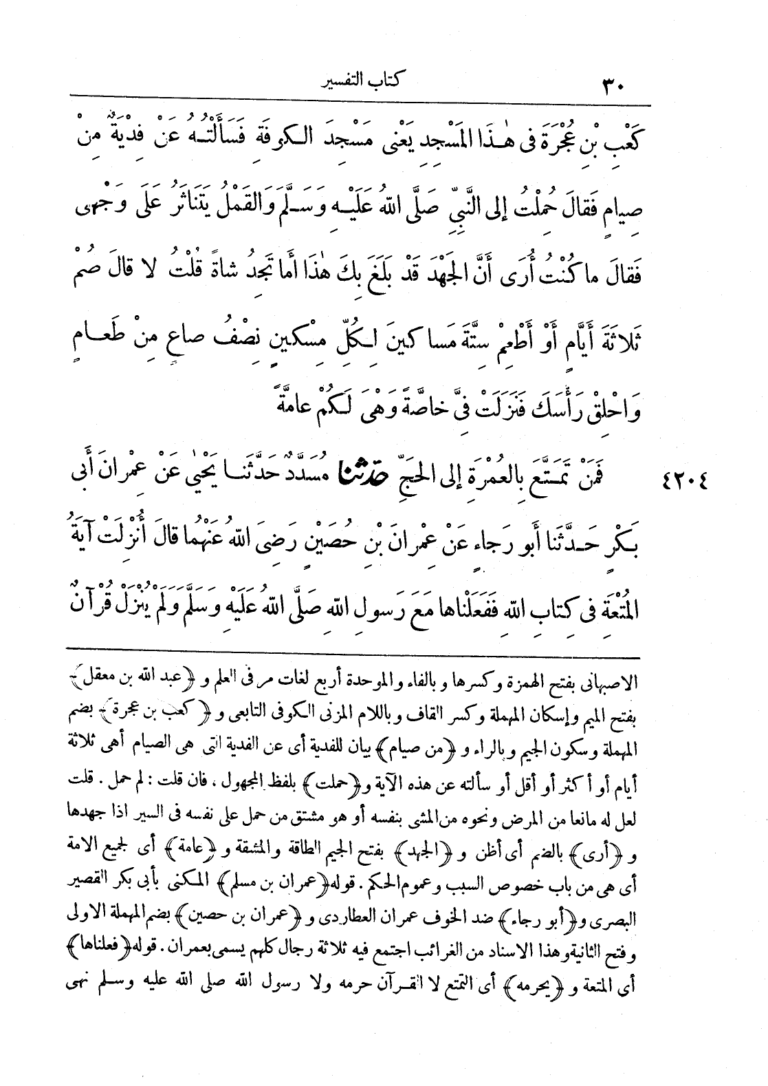 الأصبهاني بفتح الهمزة وكسرها وبالفاء والموحدة أربع لغات مر في العلم و (عبد الله بن معقل) بفتح الميم وإسكان المهملة وكسر القاف وباللام المزني الكوفي التابعي و (كعب بن عجرة) بضم المهملة وسكون الجيم وبالراء (من صيام) بيان للفدية أي عن الفدية التي هي الصيام أهي ثلاثة أيام أو أكثر أو أقل أو سألته عن هذه الآية و (حملت) بلفظ المجهول. فإن قلت: لم حمل. قلت لعل له مانعا من المرض ونحوه من المشي بنفسه أو هو مشتق من حمل على نفسه في السير إذا جهدها و (أرى) بالضم أي أظن و (الجهد) بفتح الجيم الطاقة والمشقة و (عامة) أي لجميع الأمة أي هي من باب خصوص السبب وعموم الحكم. قوله (عمران بن مسلم) المكني بأبي بكر القصير البصري و (أبو رجاء) ضد الخوف عمران العطاردي و (عمران بن حصين) بضم المهملة الأولى وفتح الثانية وهذا الإسناد من الغرائب اجتمع فيه ثلاثة رجال كلهم يسمى بعمران. قوله (فعلناها) أي المتعة و (يحرمه) أي التمتع لا القرآن حرمه ولا رسول الله صلى الله عليه وسلم نهي