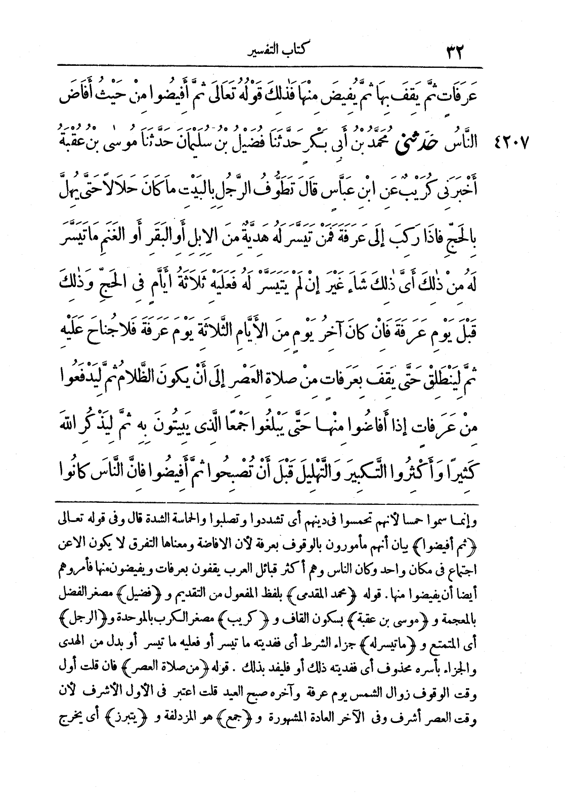 وإنما سموا حسما لأنهم تحمسوا في دينهم أي تشددوا وتصلبوا والحماسة الشدة قال وفي قوله تعالى (ثم أفيضوا) بيان أنهم مأمورون بالوقوف بعرفة لأن الإفاضة ومعناها التفرق لا يكون إلا عن اجتماع في مكان واحد وكأن الناس وهو أكثر قبائل العرب يقفون بعرفات ويفيضون منها فأمروهم أيضا أن يفيضوا منها. قوله (محمد المقدمي) بلفظ المفعول من التقديم و (فضيل) مصغر الفضل بالمعجمة و (موسى بن عقبة) بسكون القاف و (كريب) مصغر الكرب بالموحدة و (الرجل) أي المتمتع و (ما تيسر له) جزاء الشرط أي ففديته ما تيسر أو فعليه ما تيسر أو بدل من الهدى والجزاء بأسره محذوف أي ففديته ذلك. قوله (من صلاة العصر) فإن قلت أول وقت الوقوف زوال الشمس يوم عرفة وآخره صبح العيد قلت اعتبر في الأول الأشرف لأن وقت العصر أشرف وفي الآخر العادة لمشهورة و (جمع) هو المزدلفة و (يتبرز) أي يخرج