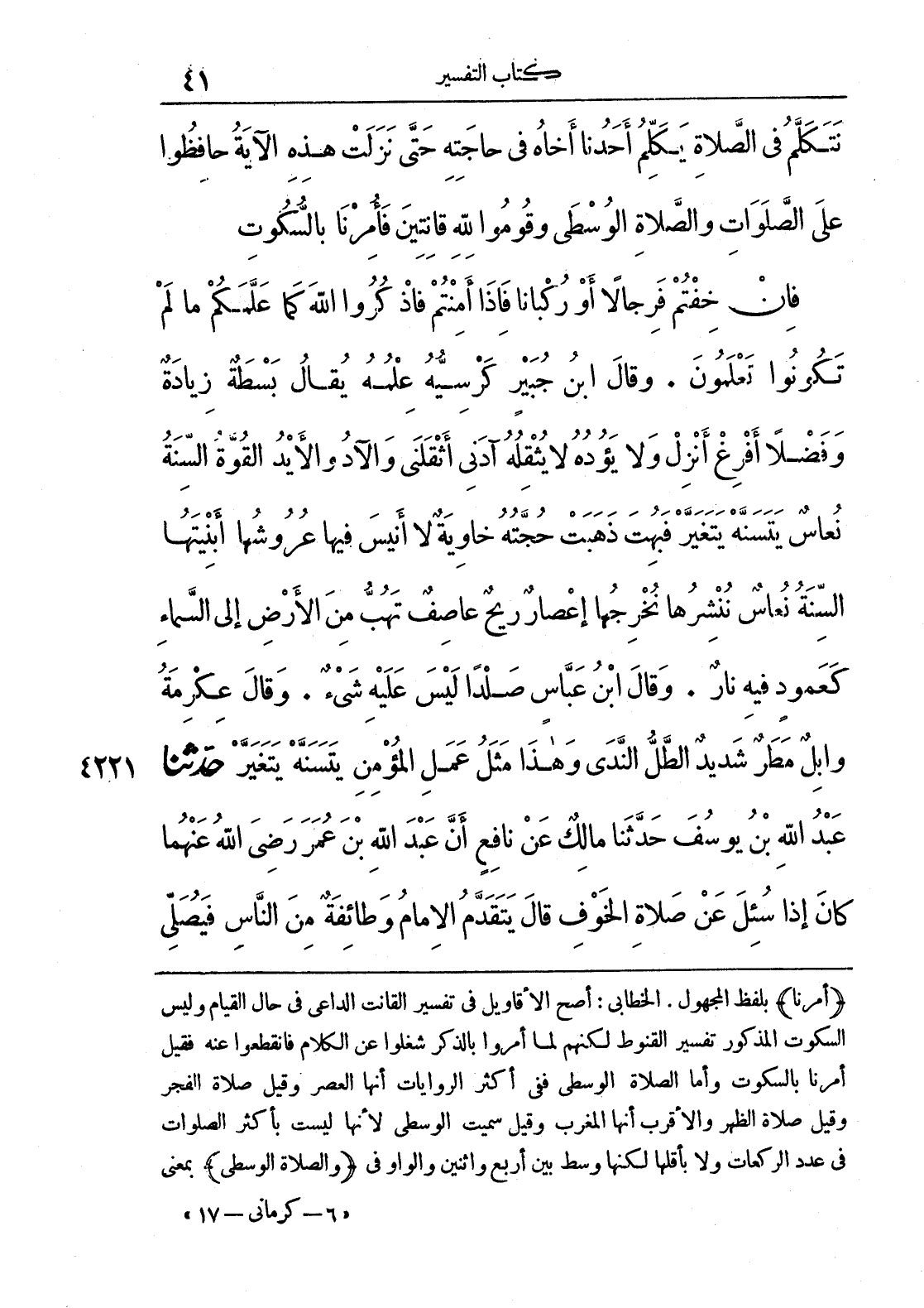 نَتَكَلَّمُ فِي الصَّلَاةِ يُكَلِّمُ أَحَدُنَا أَخَاهُ فِي حَاجَتِهِ حَتَّى نَزَلَتْ هَذِهِ الْآيَةُ {حَافِظُوا عَلَى الصَّلَوَاتِ وَالصَّلَاةِ الْوُسْطَى وَقُومُوا لِلَّهِ قَانِتِينَ} فَأُمِرْنَا بِالسُّكُوتِ بَاب قَوْلِهِ عَزَّ وَجَلَّ {فَإِنْ خِفْتُمْ فَرِجَالًا أَوْ رُكْبَانًا فَإِذَا أَمِنْتُمْ فَاذْكُرُوا اللَّهَ كَمَا عَلَّمَكُمْ مَا لَمْ تَكُونُوا تَعْلَمُونَ} وَقَالَ ابْنُ جُبَيْرٍ {كُرْسِيُّهُ} عِلْمُهُ يُقَالُ {بَسْطَةً} زِيَادَةً وَفَضْلًا {أَفْرِغْ} أَنْزِلْ {وَلَا يَئُودُهُ} لَا يُثْقِلُهُ آدَنِي أَثْقَلَنِي وَالْآدُ وَالْأَيْدُ الْقُوَّةُ السِّنَةُ نُعَاسٌ {يَتَسَنَّهْ} يَتَغَيَّرْ {فَبُهِتَ} ذَهَبَتْ حُجَّتُهُ {خَاوِيَةٌ} لَا أَنِيسَ فِيهَا عُرُوشُهَا أَبْنِيَتُهَا