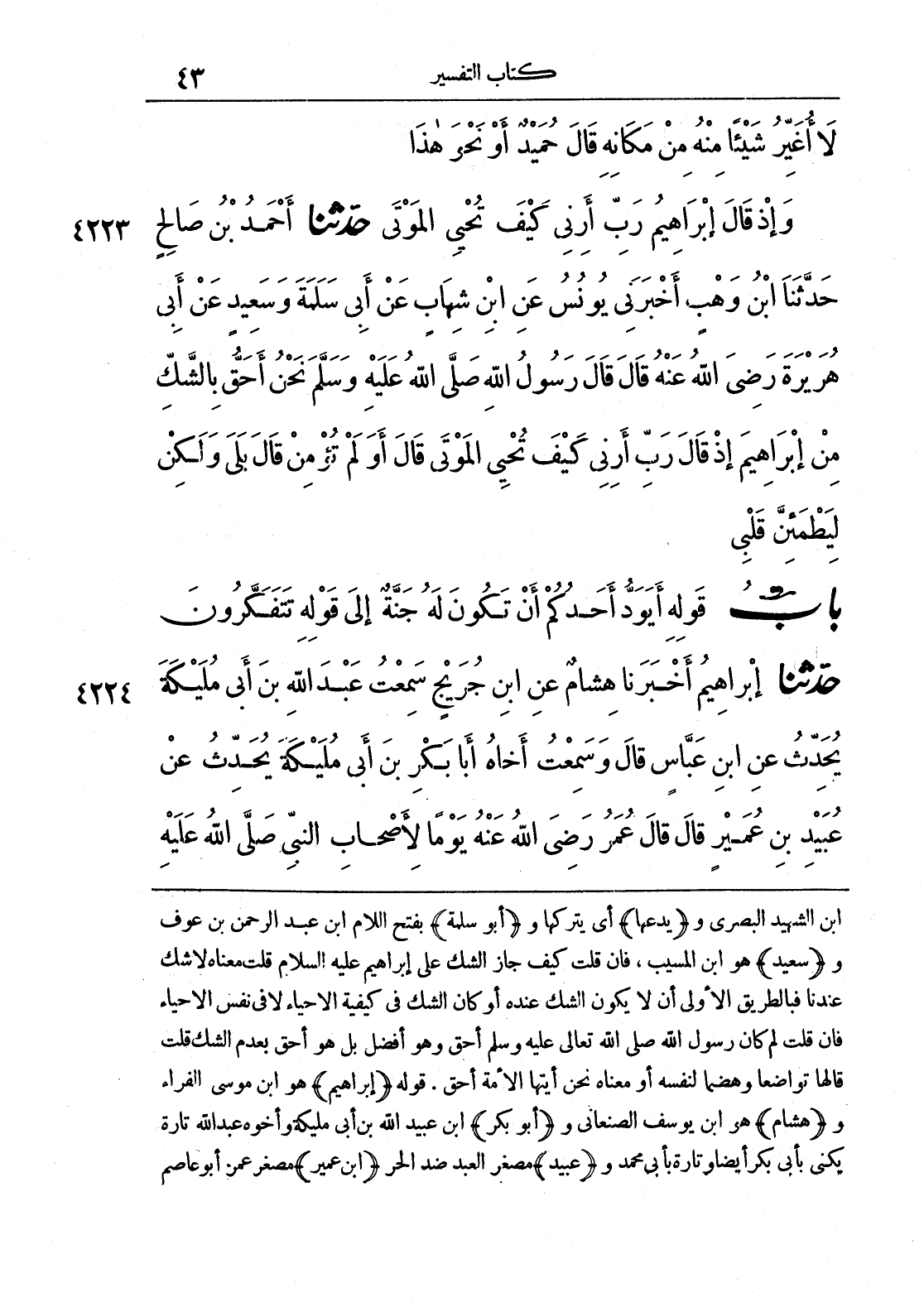 ابن الشهيد البصري و (يدعها) أي يتركها و (أبو سلمة) بفتح اللام ابن عبد الرحمن بن عوف و (سعيدج) هو ابن المسيب، فإن قلت كيف جاز الشك على إبراهيم عليه السلام قلت معناه لا شك عندنا فبالطريق الأولى أن لا يكون الشك عنده أو كان الشك في كيفية الإحياء لا في نفس الأحياء فإن قلت لم كان رسول الله صلى الله تعالى عليه وسلم أحق وهو أفضل بل هو أحق بعدم الشك قلت قالها تواضعا وهضما لنفسه أو معناه نحن أيتها الأمة أحق. قوله (إبراهيم) هو ابن موسى الفراء و (هشام) هو ابن يوسف الصنعاني و (أبو بكر) ابن عبيد الله بن أبي مليكة وأخوه عبد الله تارة يكنى بأبي بكر أيضا وتارة بأبي محمد و (عبيد) مصغر العبد ضد الحر (ابن عمير) مصغر عمر. أبو عاصم