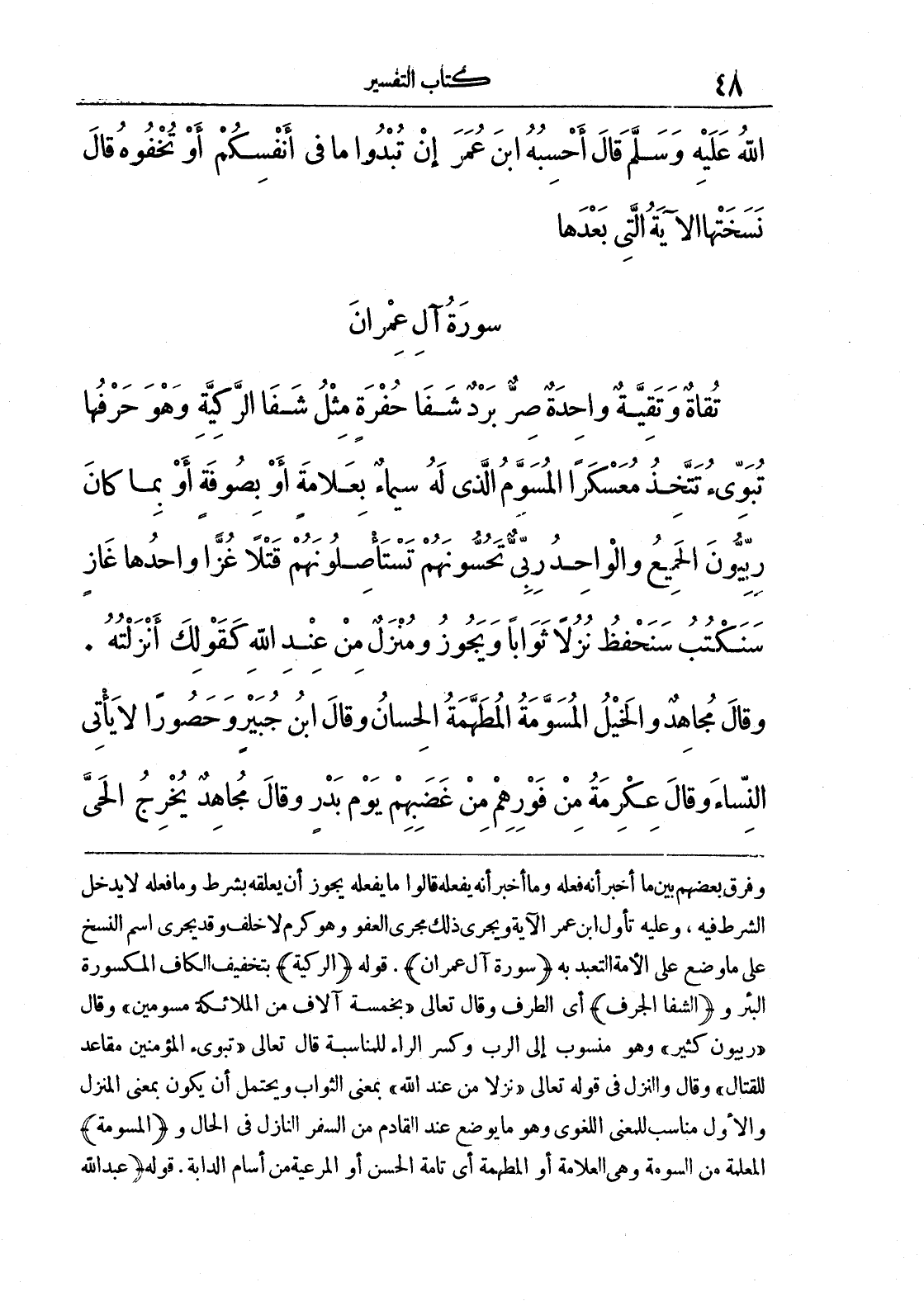 وفرق بعضهم بين ما أخبر أنه فعله وما أخبر أنه يفعله قالوا ما يفعله يجوز أ، يعلقه بشرط وما فعله لا يدخل الشرط فيه، وعليه تأول ابن عمر الآية ويجري ذلك مجرى العفو وهو كرم لا خلف وقد يجرى اسم النسخ على ما وضع على الأمة التعبد به (سورة آل عمران). قوله (الركية) بتخفيف الكاف المكسورة البئر و (الشفا الجرف) أي الطرف وقال تعالى "بخمسة آلاف من الملائكة مسومين" وقال (ربيون كثير) وهو منسوب إلى الرب وكسر الراء للمناسبة قال تعالى "تبوئ المؤمنين مقاعد للقتال" وقال والنزل في وقله تعالى "نزلا من عند الله" بمعنى الثواب ويحتمل أن يكون بمعنى المنزل والأول مناسب للمعنى اللغوي وهو ما يوضع عند القادم من السفر النازل في الحال و (المسومة) المعلمة من السومة وهي العلامة أو المطهمة أي تامة الحسن أو المرعية من أسام الدابة. قوله (عبد الله