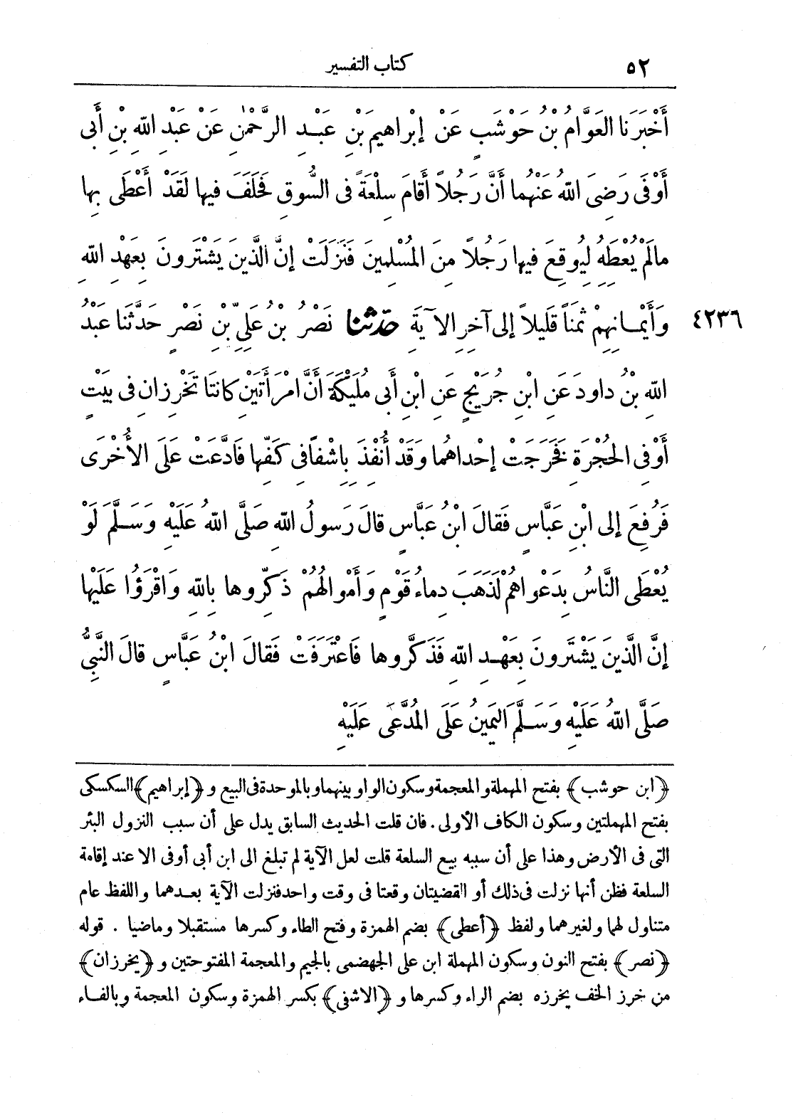 (ابن حوشب) بفتح المهملة والمعجمة وسكون الواو بينهما وبالموحدة في البيع و (إبراهيم) السكسكي بفتح المهملتين وسكون الكاف الأولى. فإن قلت الحديث السابق يدل على أن سبب النزول البئر التي في الأرض وهذا على أن سببه بيع السلعة قلت لعل الآية لم تبلغ إلى ابن أبي أوفي إلا عند إقامة السلعة فظن أنها نزلت في ذلك أو القضيتان وقعتا في وقت واحد فنزلت الآية بعدهما واللفظ عام متناول لهما ولغيرهما ولفظ (أعطى) بضم الهمزة وفتح الطاء وكسرها مستقبلا وماضيا.؟ قوله (نصر) بفتعح النون وسكون المهملة ابن علي الجهضمي بالجيم والمعجمة المفتوحتين و (يخرزان) من خرز الخف يخرزه بضم الراء وكسرها و (الأشفى) بكسر الهمزة وسكون المعجمة وبالفاء