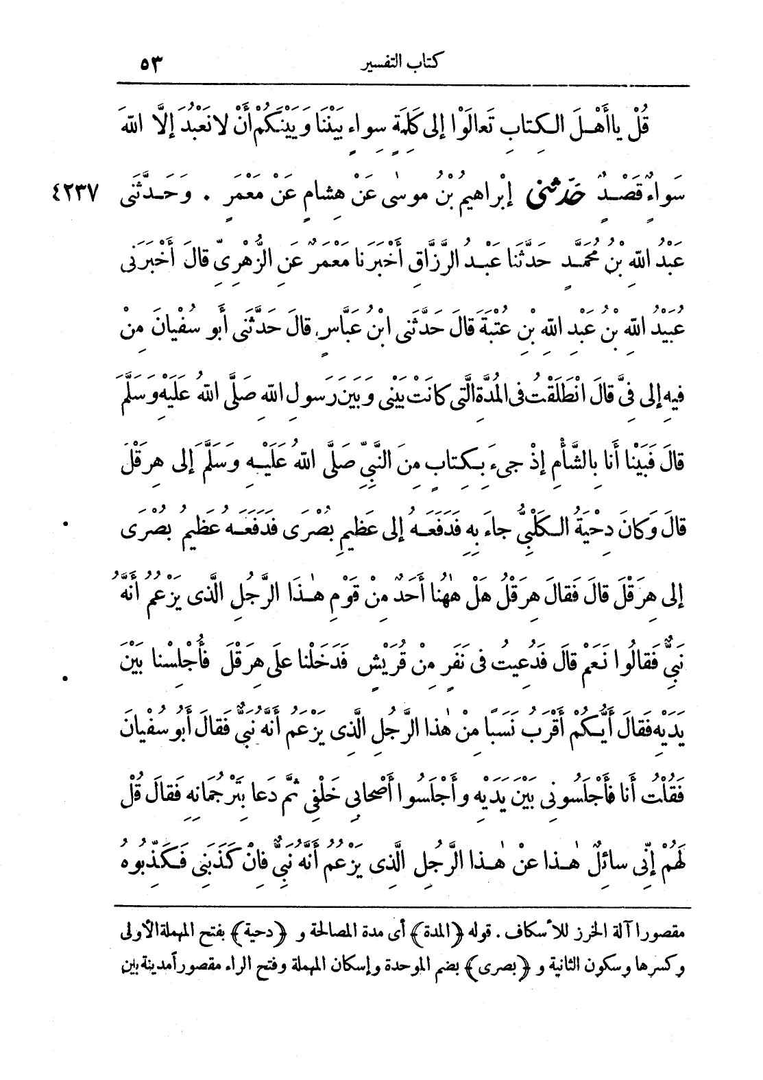 4237 - حَدَّثَنِي إِبْرَاهِيمُ بْنُ مُوسَى عَنْ هِشَامٍ عَنْ مَعْمَرٍ ح وحَدَّثَنِي عَبْدُ اللَّهِ بْنُ مُحَمَّدٍ حَدَّثَنَا عَبْدُ الرَّزَّاقِ أَخْبَرَنَا مَعْمَرٌ عَنْ الزُّهْرِيِّ قَالَ أَخْبَرَنِي عُبَيْدُ اللَّهِ بْنُ عَبْدِ اللَّهِ بْنِ عُتْبَةَ قَالَ حَدَّثَنِي ابْنُ عَبَّاسٍ قَالَ حَدَّثَنِي أَبُو سُفْيَانَ مِنْ فِيهِ إِلَى فِيَّ قَالَ