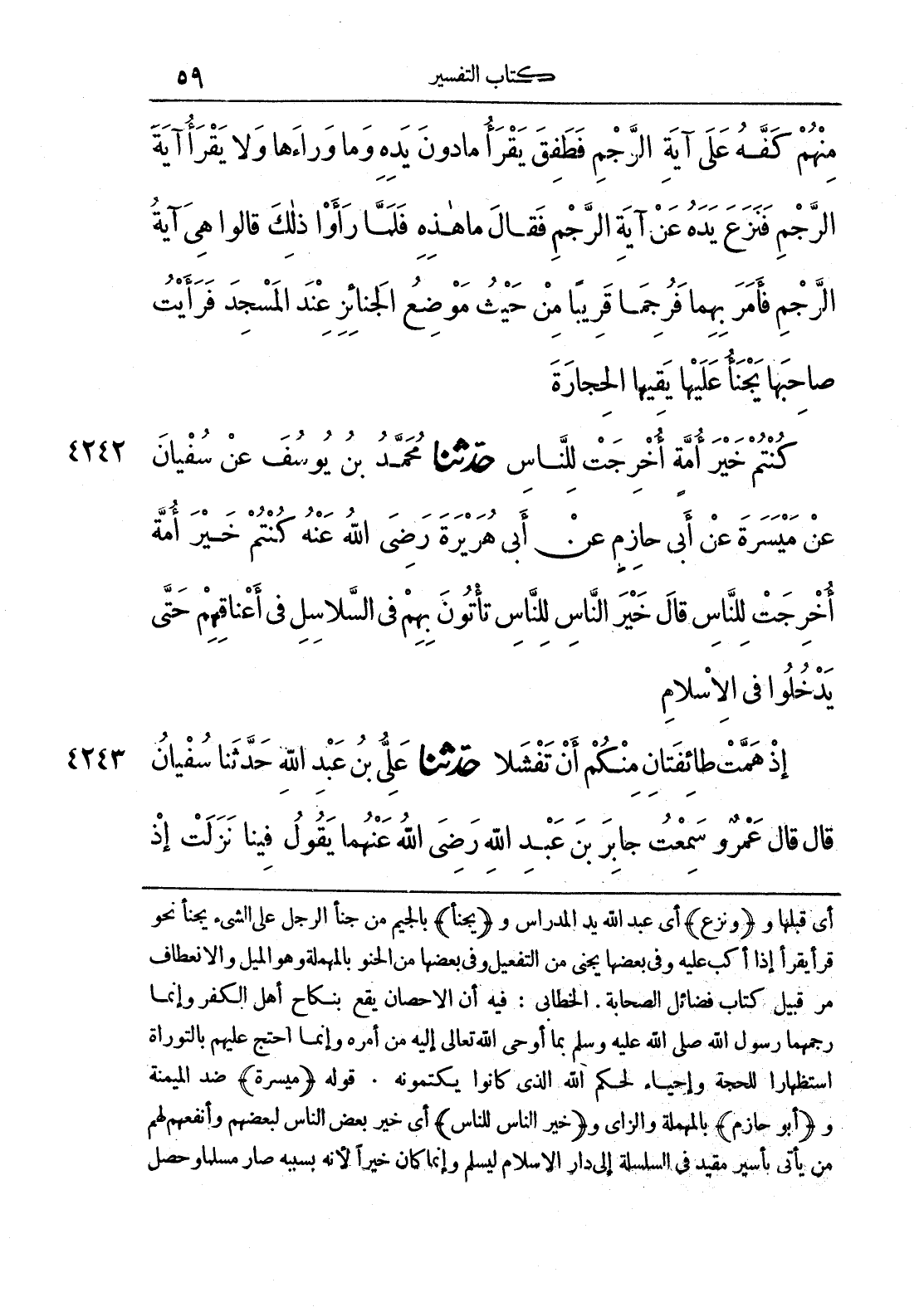 أي قبلها و (ونزع) أي عبد الله يد المدراس و (يجنأ) بالجيم من جنأ الرجل على الشيء يجنأ نحو قرأ يقرأ إذا أكب عليه وفي بعضها يجني من التفعيل وفي بعضها من الحنو بالمهملة وهو الميل والانعطاف مر قبيل كتاب فضائل الصحابة. الخطابي: فيه أن الإحصان يقع بنكاح أهل الكفر وإنما رجمهما رسول الله صلى الله عليه وسلم بما أوحى الله تعالى إليه من أمره وإنما احتج عليهم بالتوراة استظهارا للحجة وإحياء لحكم الله الذي كانوا يكتمونه. قوله (ميسرة) ضد الميمنة و (أبو حازم) بالمهملة والزاي و (خير الناس للناس) أي خير بعض الناس لبعضهم وأنفعهم لهم من يأتي بأسير مقيد في السلسلة إلى دار الإسلام ليسلم وإنما كان خيرا لأنه بسببه صار مسلما وحصل