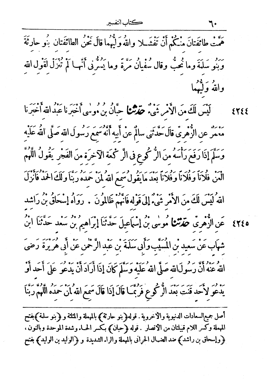 أصل جميع السعادات الدنيوية والأخروية. قوله (بنو حارثة) بالمهملة والمثلثة و (بنو سلمة) بفتح المهملة وكسر اللام قبيلتان الأنصار. قوله (حبان) بكسر الحاء وشدة الموحدة وبالنون، و (إسحاق بن راشد) ضد الضال الحراني بالمهملة والراء الشديدة و (الوليد بن الوليد) بفتح