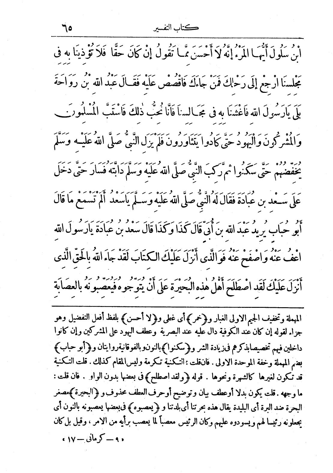 المهملة وتخفيف الجيم الأولى الغبار و (خمر) أي غطى و (لا احسن) بلفظ أفعل التفضيل وهو جزاء لقوله إن كان عند الكوفية دال عليه عند البصرية وعطف اليهود على المشركين وإن كانوا داخلين فيهم تخصيصا بذكرهم في زيادة الشر و (سكنوا) بالنون وبالفوقانية روايتان و (أبو حباب) بضم المهملة وخفة الموحدة الأولى. فإن قلت: التكنية تكرمه وليس المقام كذلك. قلت التكنية قد تكون لغيرها كالشهرة ونحوها. قوله (ولقد اصطلح) في بعضها بدون الواو. فإن قلت: ما وجهه. قلت يكون بدلا أو عطف بيان وتوضيح أو حرف العطف محذوف و (البحيرة) مصغر البحرة ضد البرة أي البليدة يقال هذه بحرتنا أي بلدتنا و (يعصبوه) في بعضها يعصبونه بالنون أي يجعلونه رئيسا لهم ويسودونه عليهم وكان الرئيس معصبا لما يعصب برأيه من الأمر، وقيل بل كان