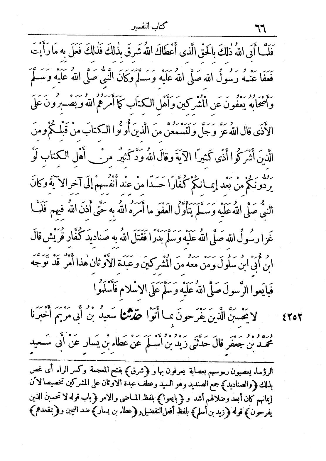 الرؤساء يعصبون رءوسهم بعصابة يعرفون بها و (شرق) بفتح المعجمة وكسر الراء أي غص بذلك و (الصناديد) جمع الصنديد وهو السيد وعطف عبدة الأوثان على المشركين تخصيصا لأن إيمانهم كان أبعد وضلالهم أشد و (بايعوا) بلفظ الماضي والأمر (باب قوله لا تحسبن الذين يفرحون) قوله (زيد بن أسلم) بلفظ أفعل التفضيل و (عطاء بن يسار) ضد اليمين و (بمقعدهم)
