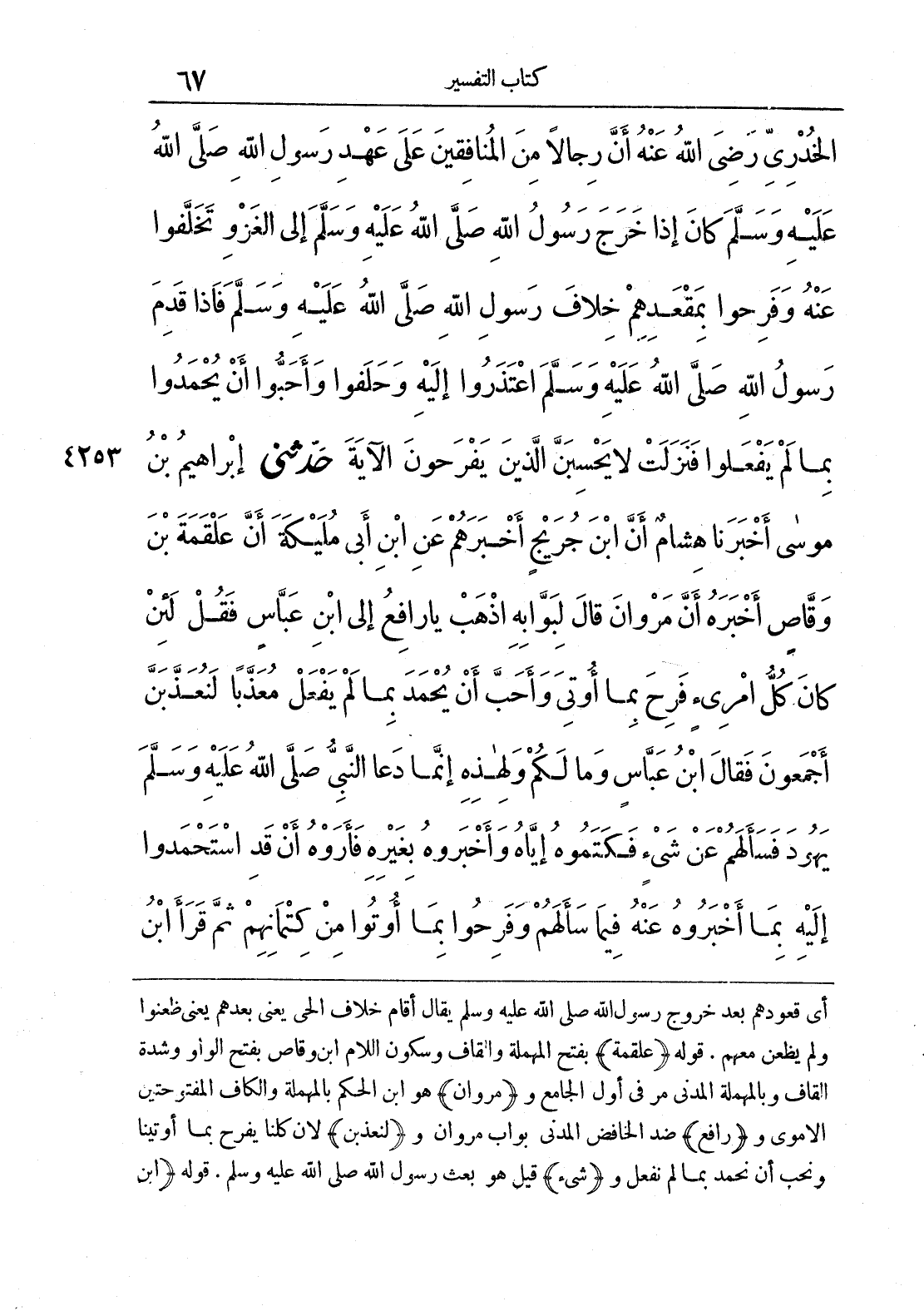 أَنَّ مَرْوَانَ قَالَ لِبَوَّابِهِ اذْهَبْ يَا رَافِعُ إِلَى ابْنِ عَبَّاسٍ فَقُلْ لَئِنْ كَانَ كُلُّ امْرِئٍ فَرِحَ بِمَا أُوتِيَ وَأَحَبَّ أَنْ يُحْمَدَ بِمَا لَمْ يَفْعَلْ مُعَذَّبًا لَنُعَذَّبَنَّ أَجْمَعُونَ فَقَالَ ابْنُ عَبَّاسٍ وَمَا لَكُمْ وَلِهَذِهِ إِنَّمَا دَعَا النَّبِيُّ صَلَّى اللَّهُ عَلَيْهِ وَسَلَّمَ يَهُودَ فَسَأَلَهُمْ عَنْ شَيْءٍ فَكَتَمُوهُ إِيَّاهُ وَأَخْبَرُوهُ بِغَيْرِهِ فَأَرَوْهُ أَنْ قَدْ اسْتَحْمَدُوا إِلَيْهِ بِمَا أَخْبَرُوهُ عَنْهُ فِيمَا سَأَلَهُمْ وَفَرِحُوا بِمَا أُوتُوا مِنْ كِتْمَانِهِمْ ثُمَّ قَرَأَ ابْنُ