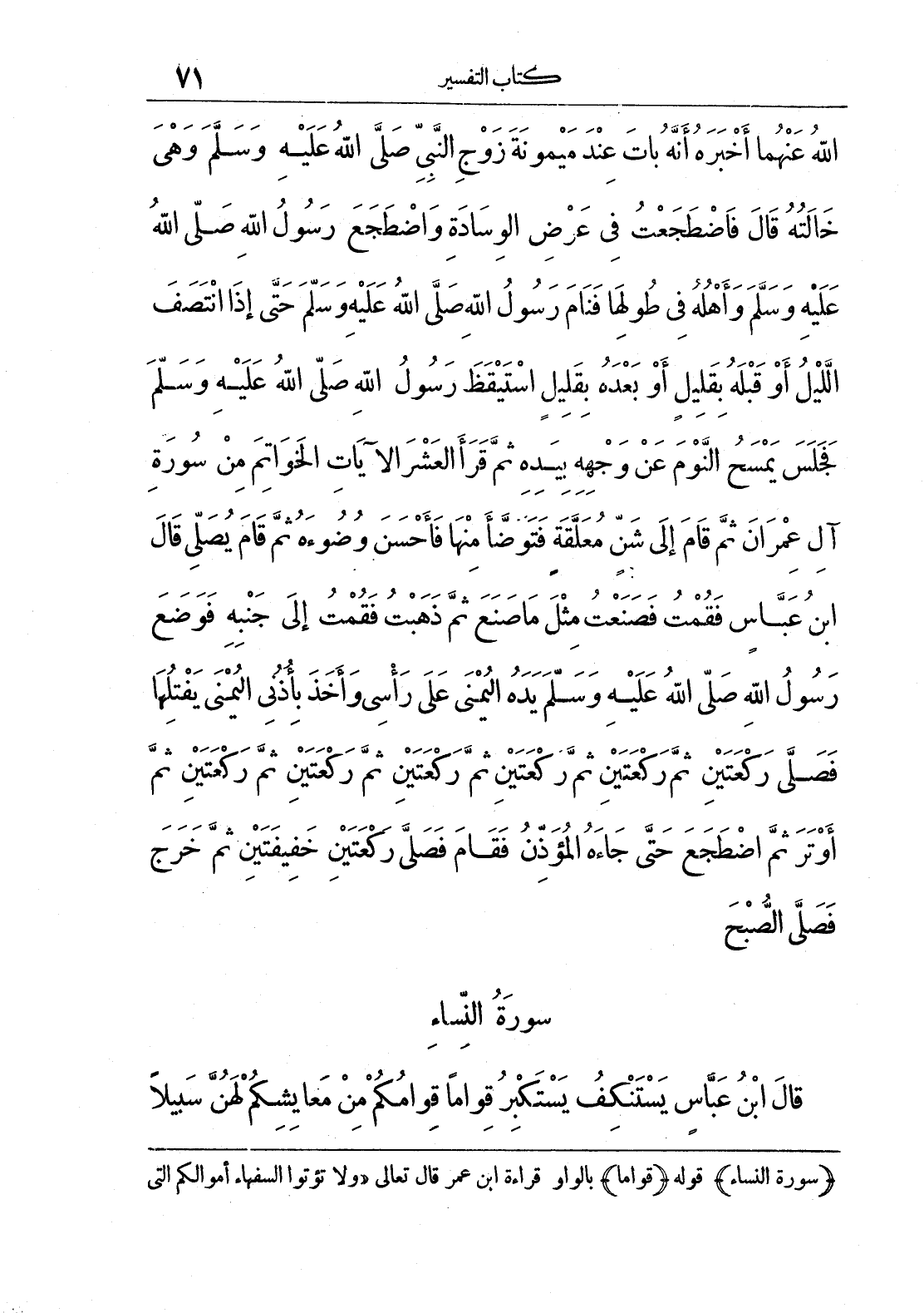 أَنَّهُ بَاتَ عِنْدَ مَيْمُونَةَ زَوْجِ النَّبِيِّ صَلَّى اللَّهُ عَلَيْهِ وَسَلَّمَ وَهْيَ خَالَتُهُ قَالَ فَاضْطَجَعْتُ فِي عَرْضِ الْوِسَادَةِ وَاضْطَجَعَ رَسُولُ اللَّهِ صَلَّى اللَّهُ عَلَيْهِ وَسَلَّمَ وَأَهْلُهُ فِي طُولِهَا فَنَامَ رَسُولُ اللَّهِ صَلَّى اللَّهُ عَلَيْهِ وَسَلَّمَ حَتَّى إِذَا انْتَصَفَ اللَّيْلُ أَوْ قَبْلَهُ بِقَلِيلٍ أَوْ بَعْدَهُ بِقَلِيلٍ اسْتَيْقَظَ رَسُولُ اللَّهِ صَلَّى اللَّهُ عَلَيْهِ وَسَلَّمَ فَجَلَسَ يَمْسَحُ النَّوْمَ عَنْ وَجْهِهِ بِيَدِهِ ثُمَّ قَرَأَ الْعَشْرَ الْآيَاتِ الْخَوَاتِمَ مِنْ سُورَةِ آلِ عِمْرَانَ ثُمَّ قَامَ إِلَى شَنٍّ مُعَلَّقَةٍ فَتَوَضَّأَ مِنْهَا فَأَحْسَنَ وُضُوءَهُ ثُمَّ قَامَ يُصَلِّي قَالَ ابْنُ عَبَّاسٍ فَقُمْتُ فَصَنَعْتُ مِثْلَ مَا صَنَعَ ثُمَّ ذَهَبْتُ فَقُمْتُ إِلَى جَنْبِهِ فَوَضَعَ رَسُولُ اللَّهِ صَلَّى اللَّهُ عَلَيْهِ وَسَلَّمَ يَدَهُ الْيُمْنَى عَلَى رَاسِي وَأَخَذَ بِأُذُنِي الْيُمْنَى يَفْتِلُهَا فَصَلَّى رَكْعَتَيْنِ ثُمَّ رَكْعَتَيْنِ ثُمَّ رَكْعَتَيْنِ ثُمَّ رَكْعَتَيْنِ ثُمَّ رَكْعَتَيْنِ ثُمَّ رَكْعَتَيْنِ ثُمَّ أَوْتَرَ ثُمَّ اضْطَجَعَ حَتَّى جَاءَهُ الْمُؤَذِّنُ فَقَامَ فَصَلَّى رَكْعَتَيْنِ خَفِيفَتَيْنِ ثُمَّ خَرَجَ فَصَلَّى الصُّبْحَ