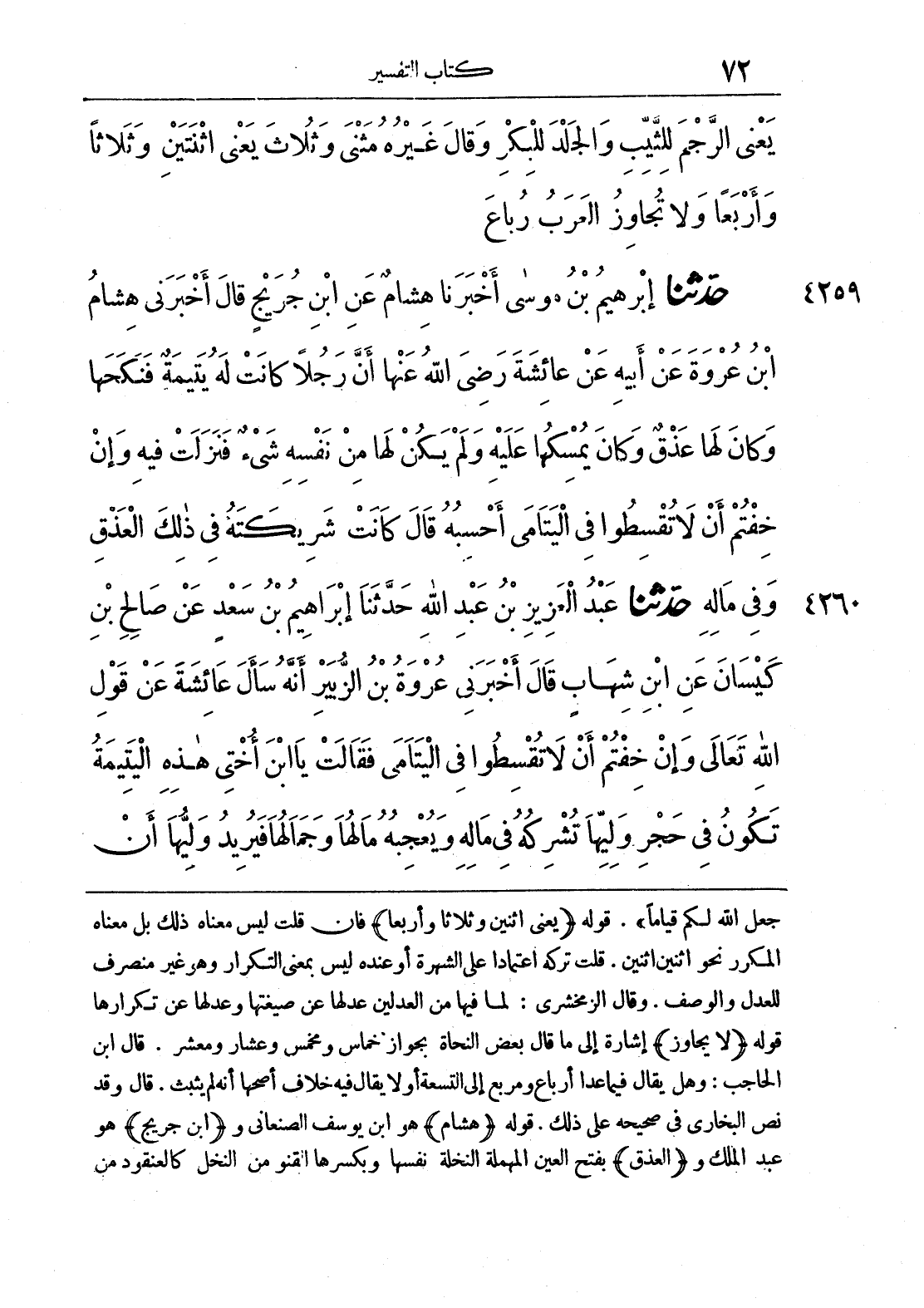جعل الله لكم قياما". قوله (يعني اثنين وثلاثا وأربعا) فإن قلت ليس معناه ذلك بل معناه المكرر نحو اثنين اثنين. قلت تركه اعتمادا على الشهرة أو عنده ليس بمعنى التكرار وهو غير منصرف للعدل والوصف. وقال الزمخشري: لما فيها من العدلين عدلها عن صيغتها وعدلها عن تكرارها قوله (لا يجاوز) إشارة إلى ما قال بعض النحاة بجواز خماس ومخمس وعشار ومعشر. قال ابن الحاجب: وهل يقال فيما عدا أرباع ومربع إلى التسعة أو لا يقال فيه خلاف أصحها أنه لم يثبت. قال وقد نص البخاري في صحيحه على ذلك. قوله (هشام) هو ابن يوسف الصنعاني و (ابن جريج) هو عبد الملك و (العذق) بفتح العين المهملة النخلة نفسها وبكسرها القنو من النخل كالعنقود من