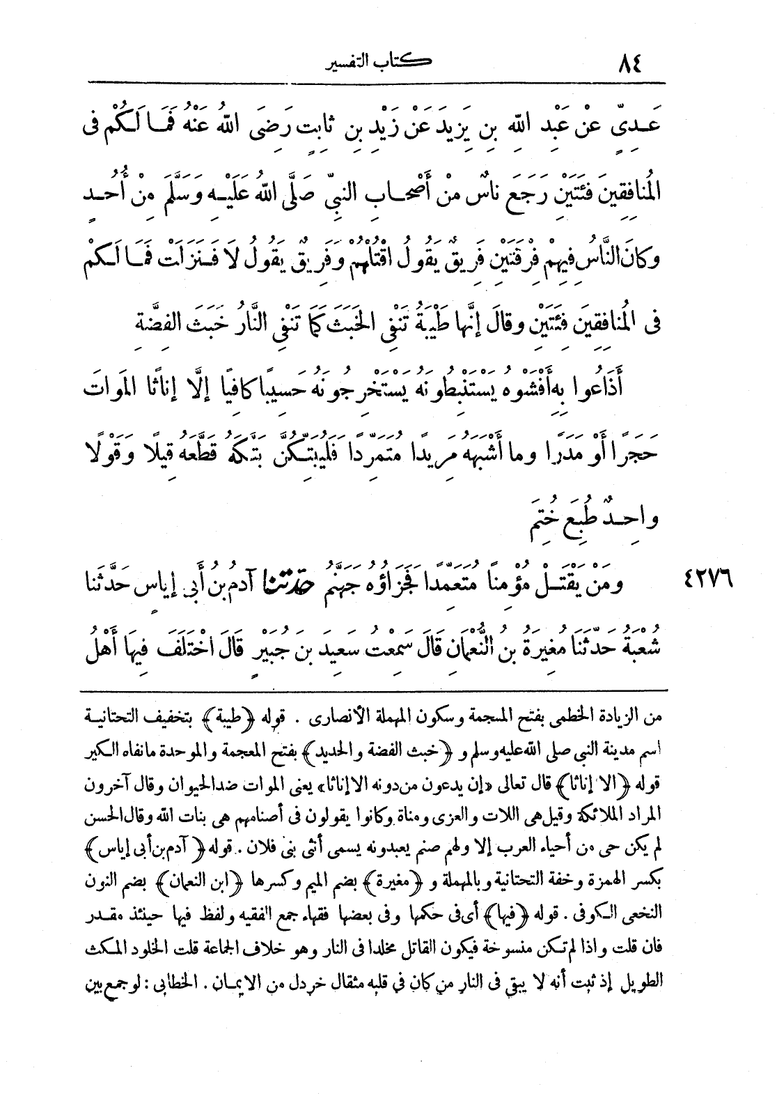رَجَعَ نَاسٌ مِنْ أَصْحَابِ النَّبِيِّ صَلَّى اللَّهُ عَلَيْهِ وَسَلَّمَ مِنْ أُحُدٍ وَكَانَ النَّاسُ فِيهِمْ فِرْقَتَيْنِ فَرِيقٌ يَقُولُ اقْتُلْهُمْ وَفَرِيقٌ يَقُولُ لَا فَنَزَلَتْ {فَمَا لَكُمْ فِي الْمُنَافِقِينَ فِئَتَيْنِ}