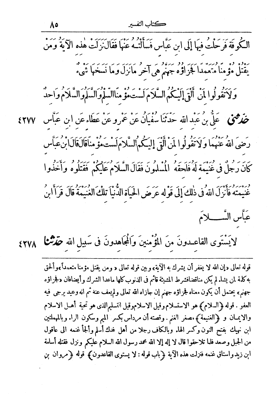 قوله تعالى "إن الله لا يغفر أن يشرك به" الآية وبين قوله تعالى "ومن يقتل مؤمنا متعمدا" والحق به كلمة لمن يشاء لم يكن مناقضا فشرط المشيئة قائم في الذنوب كلها ماعدا الشرك وأيضا فإن "فجزاؤه جهنم" يحتمل أن يكون معناه فجزاؤه جهنم إن جازاه الله تعالى ولم يعف عنه ثم أنه وعيد يرجى فيه العفو. قوله (السلام) هو الاستسلام وقيل الإسلام وقيل التسليم الذي هو تحية أهل الإسلام والإيمان و (الغنيمة) مصغر الغنم. وقصته أن مرداس بكسر الميم وسكون الراء وبالمهملتين ابن نهيك بفتح النون وكسر الهاء وبالكاف رجلا من أهل فدك أسلم وألجأ غنمه إلى عاقول من الجبل وصعد فلما تلاحقوا قال لا إله إلا الله محمد رسول الله السلام عليكم ونزل فقتله أسامه ابن زيد واستاق غنمه فنزلت هذه الآية (باب قوله: لا يستوي القاعدون) قوله (مروان بن