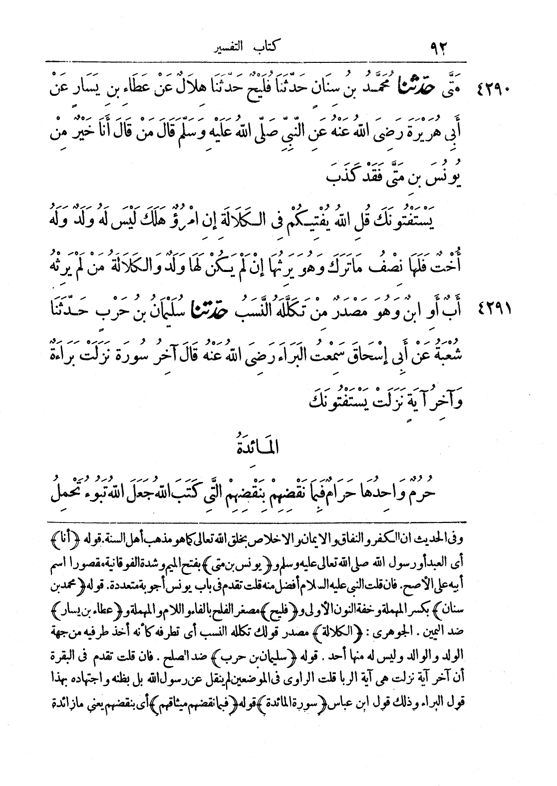 وفي الحديث أن الكفر والنفاق والإيمان والإخلاص بخلق الله تعالى كما هو مذهب أهل السنة. قوله (أنا) أي العبد أو رسول الله صلى الله تعالى عليه وسلم و (يونس بن متى) بفتح الميم وشدة الفوقانية مقصورا اسم أبيه على الأصح. فإن قلت النبي عليه السلام أفضل منه قلت تقدم في باب يونس أجوبة متعددة و (عطاء بن يسار) ضد اليمين. الجوهري: (الكلالة) مصدر قولك تكلله النسب أي تطرفه كأنه أخذ طرفيه من جهة الولد والوالد وليس له منها أحد. قوله (سليمان بن حرب) ضد الصلح. فإن قلت تقدم في البقرة أن آخر آية نزلت هي آية الربا قلت الراوي في الموضعين لم ينقل عن رسول الله بل بظنه واجتهاده بهذا قول البراء وذلك قول ابن عباس (سورة المائدة) قوله (فبما نقضهم ميثاقهم) أي بنقضهم يعني ما زائدة