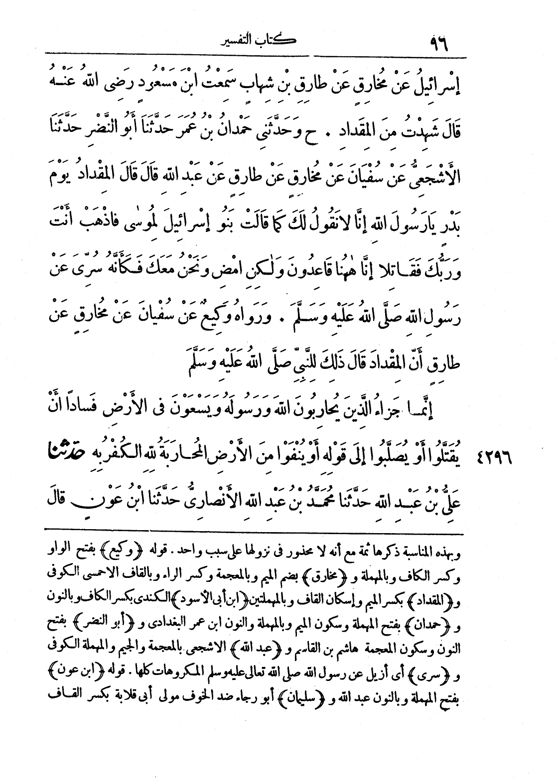 وبهذه المناسبة ذكرها ثمة مع أنه لا محذور في نزولها على سبب واحد. قوله (وكيع) بفتح الواو وكسر الكاف وبالمهملة و (مخارق) بضم الميم وبالمعجمة وكسر الراء وبالقاف الأحمسي الكوفي و (المقداد) بكسر الميم وإسكان القاف وبالمهملتين (ابن أبي الأسود) الكندي بكسر الكاف وبالنون و (حمدان) بفتح المهملة وسكون الميم وبالمهملة والنون وابن عمر البغدادي و (أبو النضر) بفتح النون وسكون المعجمة هاشم بن القاسم و (عبد الله) الأشجعي بالمعجمة والجيم والمهملة الكوفي و (سري) أي أزيل عن رسول الله صلى الله تعالى عليه وسلم المكروهات كلها. قوله (ابن عون) بفتح المهملة وبالنون عبد الله و (سليمان) أبو رجاء ضد الخوف مولى أبي قلابة بكسر القاف