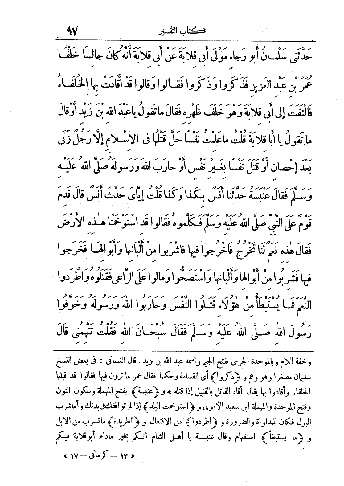 وخفة اللام وبالموحدة الجرمي بفتح الجيم واسمه عبد الله بن يزيد. قال الغساني: في بعض النسخ سليمان مصغرا وهو وهم و (ذكروا) أي القسامة وحكمها فقال عمر ما ترون فيها فقالوا قد قبلها الخلفاء وأقادوا بها يقال أقاد القاتل بالقتيل إذا قتله به و (عنبسة) بفتح المهملة وسكون النون وفتح الموحدة والمهملة وابن سعيد الأموي و (استوخمت البلد) إذا لم توافقك في بدنك وأما شرب البول فكان للمداواة والضرورة و (اطردوا) من الافتعال و (الطريدة) ما تسرب من الإبل و (ما يستبطأ) استفهام وقال عنبسة يا أهل الشام أنكم بخير مادام أبو قلابة فيكم