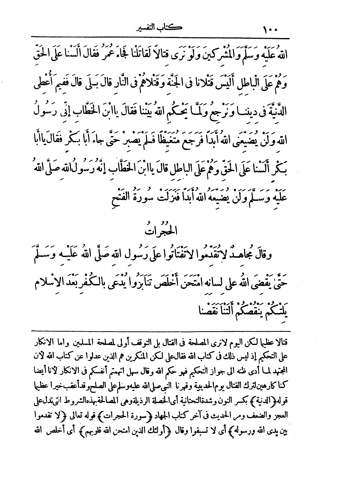 قتالاً عظيماً لكن اليوم لا نرى المصلحة في القتال بل التوقف أولى لمصلحة المسلمين وأما الإنكار على التحكيم إذ ليس ذلك في كتاب الله فقال على لكن المنكرين هم الذين عدلوا عن كتاب الله لأن المجتهد لما أدى ظنه إلى جواز التحكيم فهو حكم الله وقال سهل اتهمتم أنفسكم في الإنكار لأنا أيضاً كنا كارهين لترك القتال يوم الحديبية وقهرنا النبي صلى الله عليه وسلم على الصلح وقد أعقب خيراً عظيماً قوله (الدنية) بكسر النون وشدة التحتانية أي الخصلة الرذيلة وهي المصالحة بهذه الشروط التي تدل على العجز والضعف ومر الحديث في آخر كتاب الجهاد (سورة الحجرات) قوله تعالى (لا تقدموا بين يدي الله ورسوله) أي لا تسبقوا وقال (أولئك الذين امتحن الله قلوبهم) أي أخلص الله