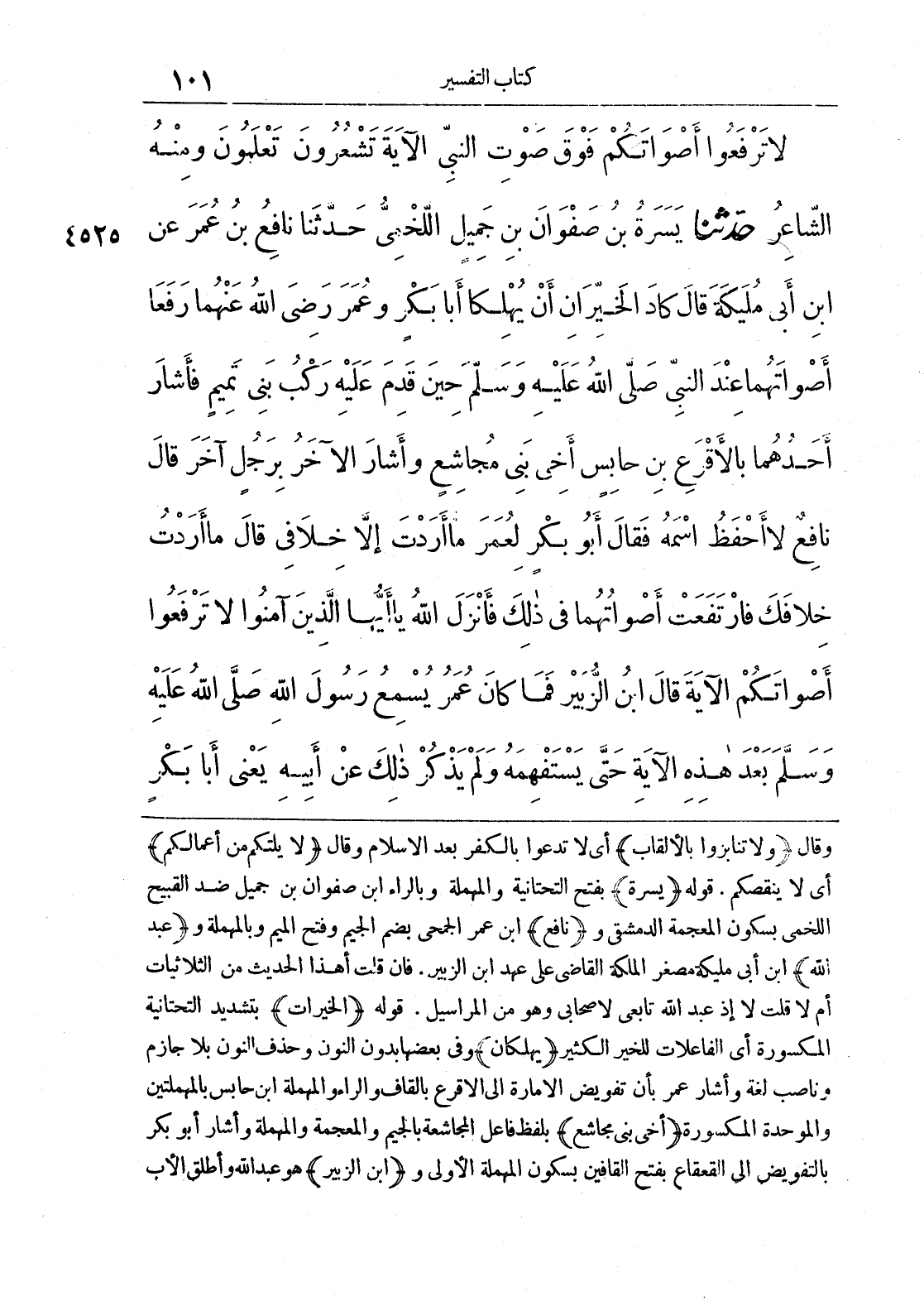 4525 - حَدَّثَنَا يَسَرَةُ بْنُ صَفْوَانَ بْنِ جَمِيلٍ اللَّخْمِيُّ حَدَّثَنَا نَافِعُ بْنُ عُمَرَ عَنْ ابْنِ أَبِي مُلَيْكَةَ قَالَ كَادَ الْخَيِّرَانِ أَنْ يَهْلِكَا أَبُو بَكْرٍ وَعُمَرُ رَضِيَ اللَّهُ عَنْهُمَا رَفَعَا أَصْوَاتَهُمَا عِنْدَ النَّبِيِّ صَلَّى اللَّهُ عَلَيْهِ وَسَلَّمَ حِينَ قَدِمَ عَلَيْهِ رَكْبُ بَنِي تَمِيمٍ فَأَشَارَ أَحَدُهُمَا بِالْأَقْرَعِ بْنِ حَابِسٍ أَخِي بَنِي مُجَاشِعٍ وَأَشَارَ الْآخَرُ بِرَجُلٍ آخَرَ قَالَ نَافِعٌ لَا أَحْفَظُ اسْمَهُ فَقَالَ أَبُو بَكْرٍ لِعُمَرَ مَا أَرَدْتَ إِلَّا خِلَافِي قَالَ مَا أَرَدْتُ خِلَافَكَ فَارْتَفَعَتْ أَصْوَاتُهُمَا فِي ذَلِكَ فَأَنْزَلَ اللَّهُ {يَا أَيُّهَا الَّذِينَ آمَنُوا لَا تَرْفَعُوا أَصْوَاتَكُمْ} الْآيَةَ قَالَ ابْنُ الزُّبَيْرِ فَمَا كَانَ عُمَرُ يُسْمِعُ رَسُولَ اللَّهِ صَلَّى اللَّهُ عَلَيْهِ وَسَلَّمَ بَعْدَ هَذِهِ الْآيَةِ حَتَّى يَسْتَفْهِمَهُ وَلَمْ يَذْكُرْ ذَلِكَ عَنْ أَبِيهِ يَعْنِي أَبَا بَكْرٍ