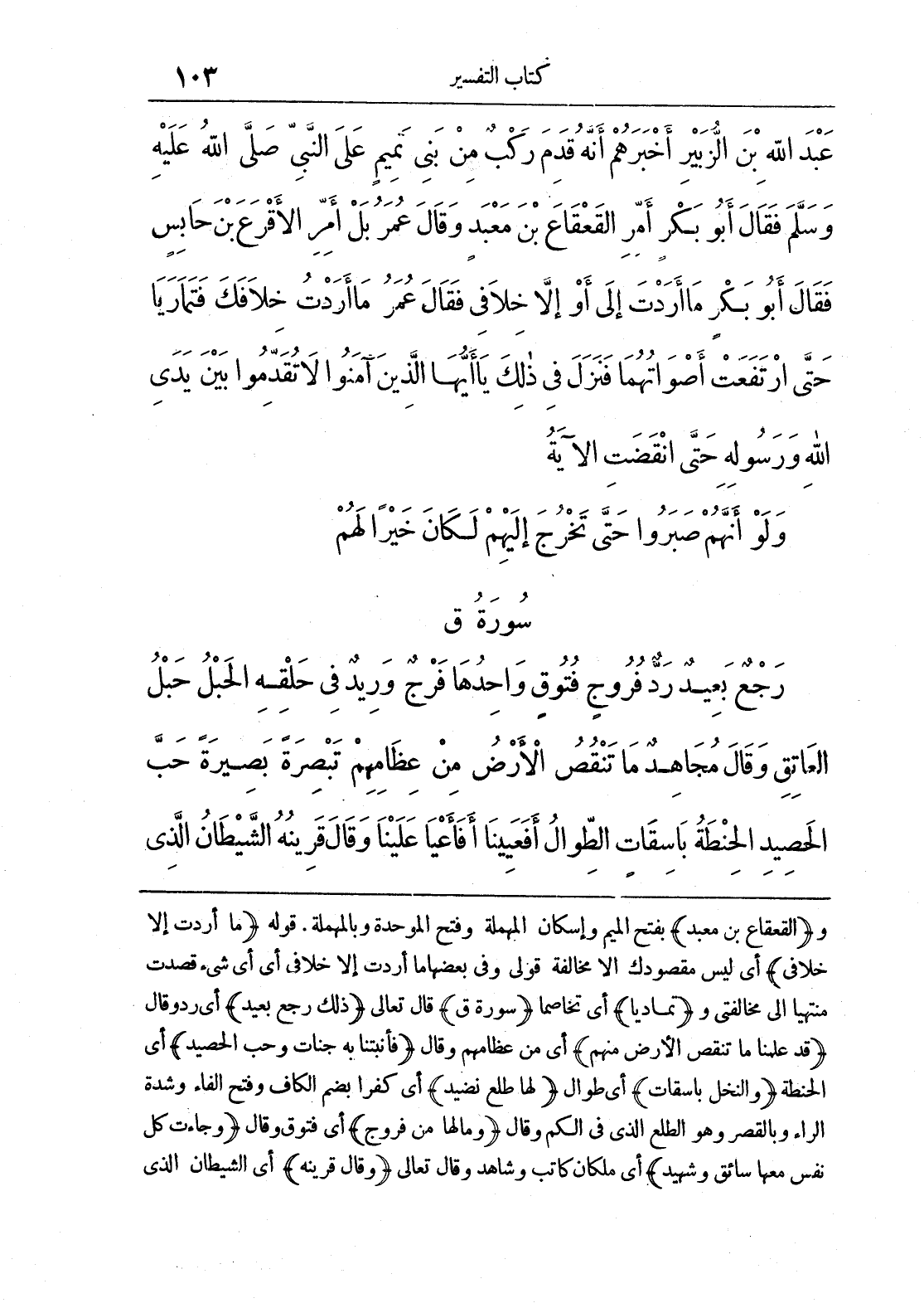و (القعقاع بن معبد) بفتح الميم وإسكان المهملة وفتح الموحدة وبالمهملة. قوله (ما أردت إلا خلافي) أي ليس مقصودك إلا مخالفة قولي وفي بعضها ما أردت إلا خلافي أي أي شيء قصدت منتهياً إلى مخالفتي و (تماديا) أي تخاصما (سورة ق) قال تعالى (ذلك رجع بعيد) أي ردو قال (قد علمنا ما تنقص الأرض منهم) أي من عظامهم وقال (فأنبتنا به جنات وحب الحصيد) أي الحنطة (والنخل باسقات) أي طوال (لها طلع نضيد) أي كفرا بضم الكاف وفتح الفاء وشدة الراء وبالقصر وهو الطلع الذي في الكم وقال (وما لها من فروج) أي فتوق وقال (وجاءت كل نفس معها سائق وشهيد) أي ملكان كاتب وشاهد وقال تعالى (وقال قرينه) أي الشيطان الذي