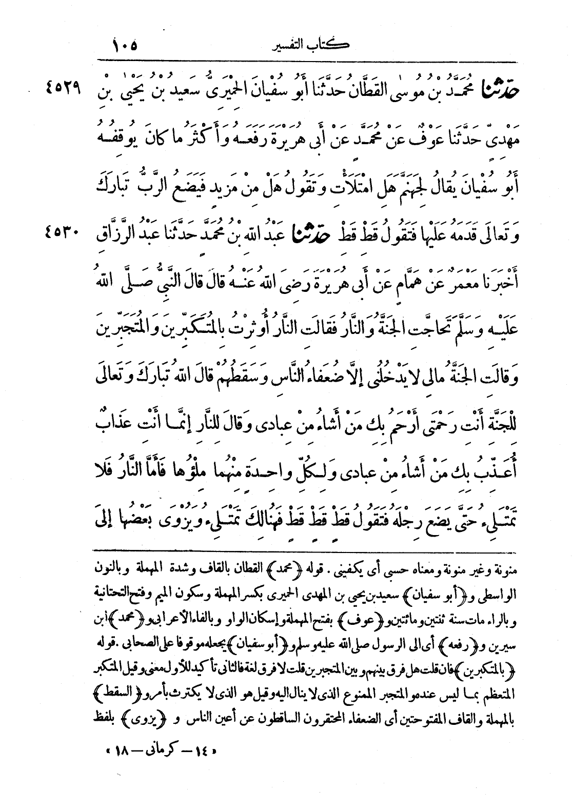 4529 - حَدَّثَنَا مُحَمَّدُ بْنُ مُوسَى الْقَطَّانُ حَدَّثَنَا أَبُو سُفْيَانَ الْحِمْيَرِيُّ سَعِيدُ بْنُ يَحْيَى بْنِ مَهْدِيٍّ حَدَّثَنَا عَوْفٌ عَنْ مُحَمَّدٍ عَنْ أَبِي هُرَيْرَةَ رَفَعَهُ وَأَكْثَرُ مَا كَانَ يُوقِفُهُ أَبُو سُفْيَانَ يُقَالُ {لِجَهَنَّمَ هَلْ امْتَلَاتِ وَتَقُولُ هَلْ مِنْ مَزِيدٍ} فَيَضَعُ الرَّبُّ تَبَارَكَ وَتَعَالَى قَدَمَهُ عَلَيْهَا فَتَقُولُ قَطْ قَطْ