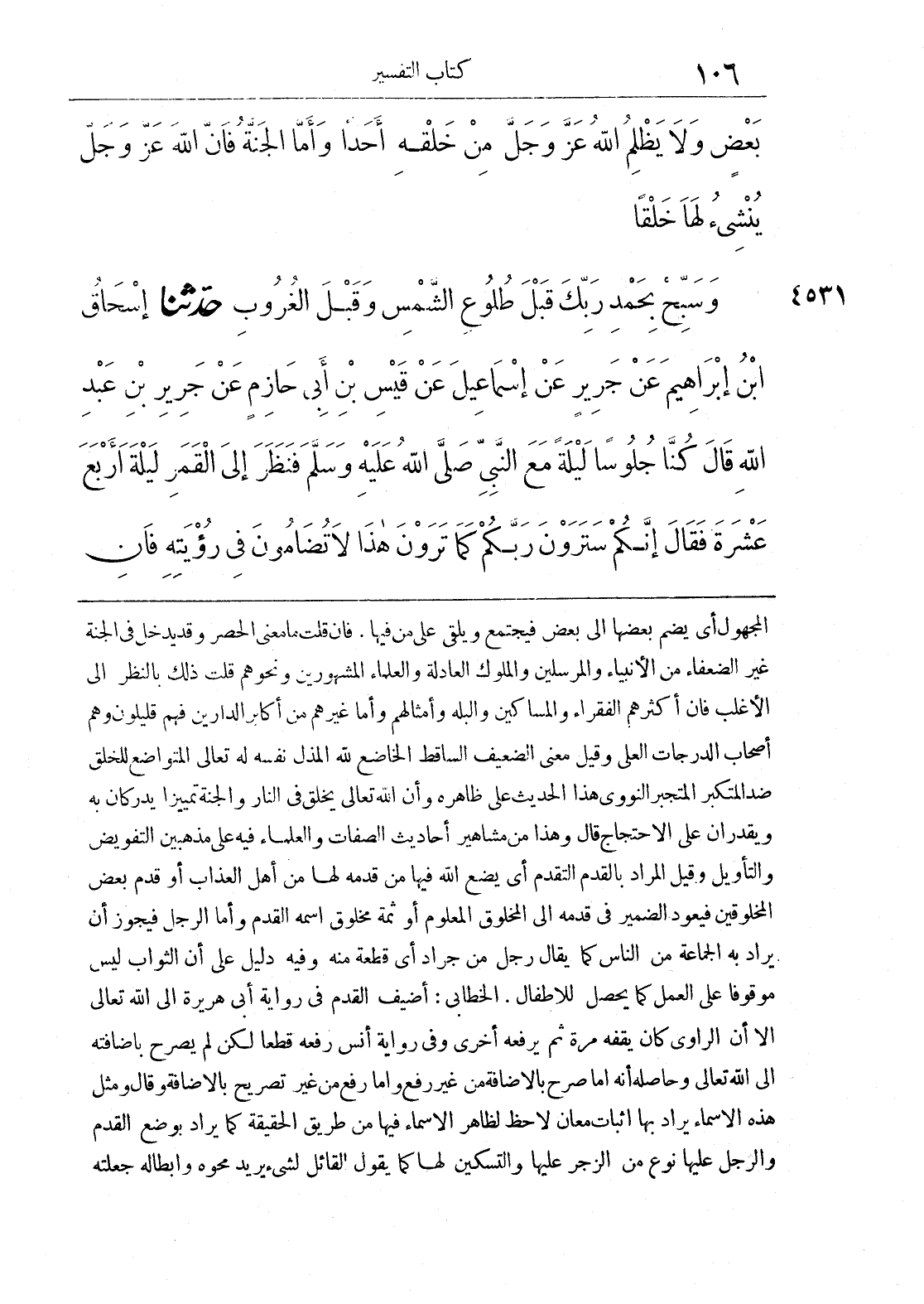 4531 - حَدَّثَنَا إِسْحَاقُ بْنُ إِبْرَاهِيمَ عَنْ جَرِيرٍ عَنْ إِسْمَاعِيلَ عَنْ قَيْسِ بْنِ أَبِي حَازِمٍ عَنْ جَرِيرِ بْنِ عَبْدِ اللَّهِ قَالَ كُنَّا جُلُوسًا لَيْلَةً مَعَ النَّبِيِّ صَلَّى اللَّهُ عَلَيْهِ وَسَلَّمَ فَنَظَرَ إِلَى الْقَمَرِ لَيْلَةَ أَرْبَعَ عَشْرَةَ فَقَالَ إِنَّكُمْ سَتَرَوْنَ رَبَّكُمْ كَمَا تَرَوْنَ هَذَا لَا تُضَامُونَ فِي رُؤْيَتِهِ فَإِنْ