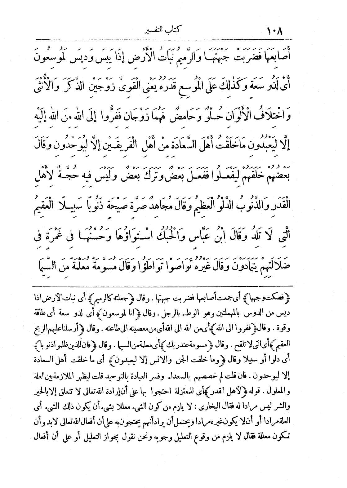 (فصكت وجهها) أي جمعت أصابعها فضربت جبهتها. وقال (جعلته كالرميم) أي نبات الأرض إذا ديس من الدوس بالمهملتين وهو الوطء بالرجل. وقال (إنا لموسعون) أي لذو سعة أي طاقة وقوة، وقال (ففروا إلى الله) أي من الله إلى الله أي من معصيته إلى طاعته، وقال (أرسلنا عليهم الريح العقيم) أي التي لا تلقح. وقال (مسومة عند ربك) أي معلمة من السيما، وقال (فإن للذين ظلموا ذنوباً) أي دلوا أو سبيلاً وقال (وما خلقت الجن والإنس إلا ليعبدون) أي ما خلقت أهل السعادة إلا ليوحدون، فإن قلت لم خصصهم بالسعداء وفسر العبادة بالتوحيد قلت ليظهر الملازمة بين العلة والمعلول. قوله (لأهل القدر) أي للمعتزلة احتجوا بها إلى أن إرادة الله تعالى لا تتعلق إلا بالخير والشر ليس مراداً له فقال البخاري: لا يلزم من كون الشيء معللاً بشيء أن يكون ذلك الشيء أي العلة مراداً أو أن لا يكون غيره مراداً ويحتمل أن يراد أنهم يحتجون به على أفعال الله تعالى لابد وأن تكون معللة فقال لا يلزم من وقوع التعليل وجوبه ونحن نقول بجواز التعليل أو على أن أفعال