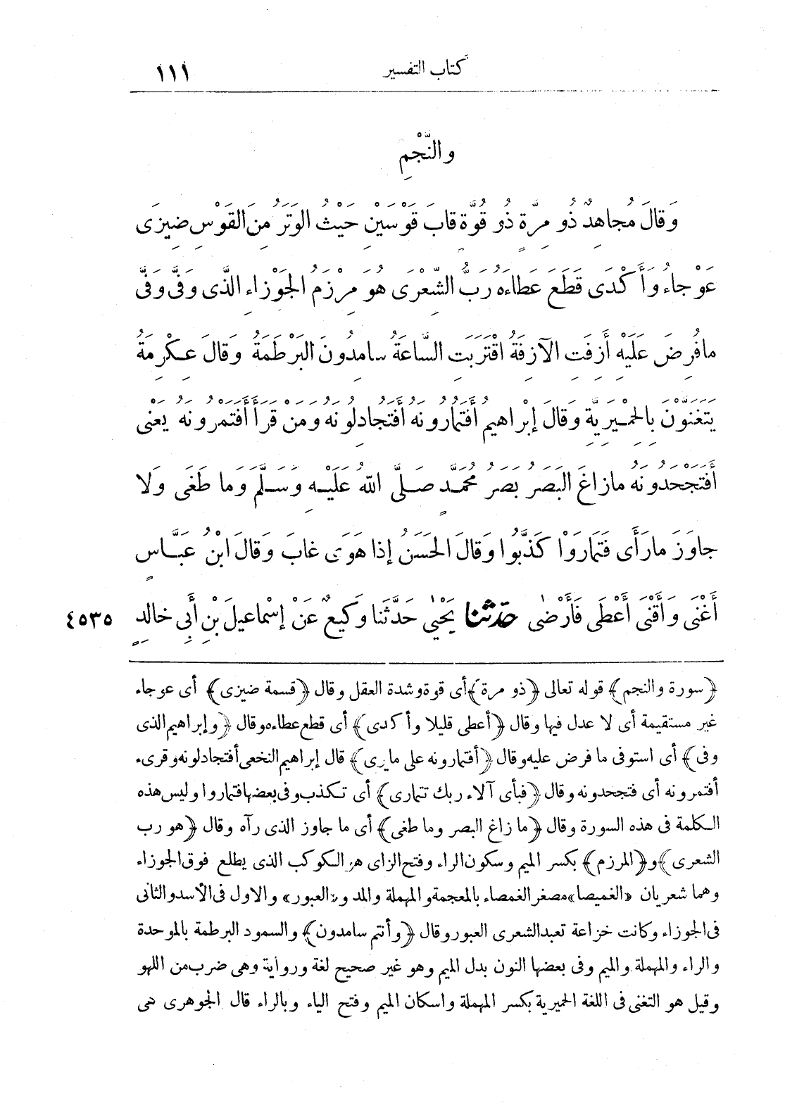 (سورة والنجم) قوله تعالى (ذو مرة) أي قوة وشدة العقل وقال (قسمة ضيزي) أي عوجاء غير مستقيمة أي لا عدل فيها وقال (أعطى قليلاً وأكدي) أي قطع عطاءه وقال (وإبراهيم الذي وفى) أي استوفى ما فرض عليه وقال (أفتمارونه على ما يرى) قال إبراهيم النخعي أفتجادلونه وقرئ أفتمرونه أي فتجحدونه وقال (فبأي آلاء ربك تتمارى) أي تكذب وفي بعضها فتماروا وليس هذه الكلمة في هذه السورة وقال (ما زاغ البصر وما طغى) أي ما جاوز الذي رآه وقال (هو رب الشعري) و (المرزم) بكسر الميم وسكون الراء وفتح الزاي هو الكوكب الذي يطلع فوق الجوزاء وهما شعريان «الغميصاء» مصغر الغمصاء بالمعجمة والمهملة والمد و «العبور» والأول في الأسد والثاني في الجوزاء وكانت خزاعة تعبد الشعري العبور وقال (وأنتم سامدون) والسمود البرطمة بالموحدة والراء والمهملة والميم وفي بعضها النون بدل الميم وهو غير صحيح لغة ورواية وهي ضرب من اللهو وقيل هو التغني في اللغة الحميرية بكسر المهملة وإسكان وفتح الياء وبالراء قال الجوهري هي
