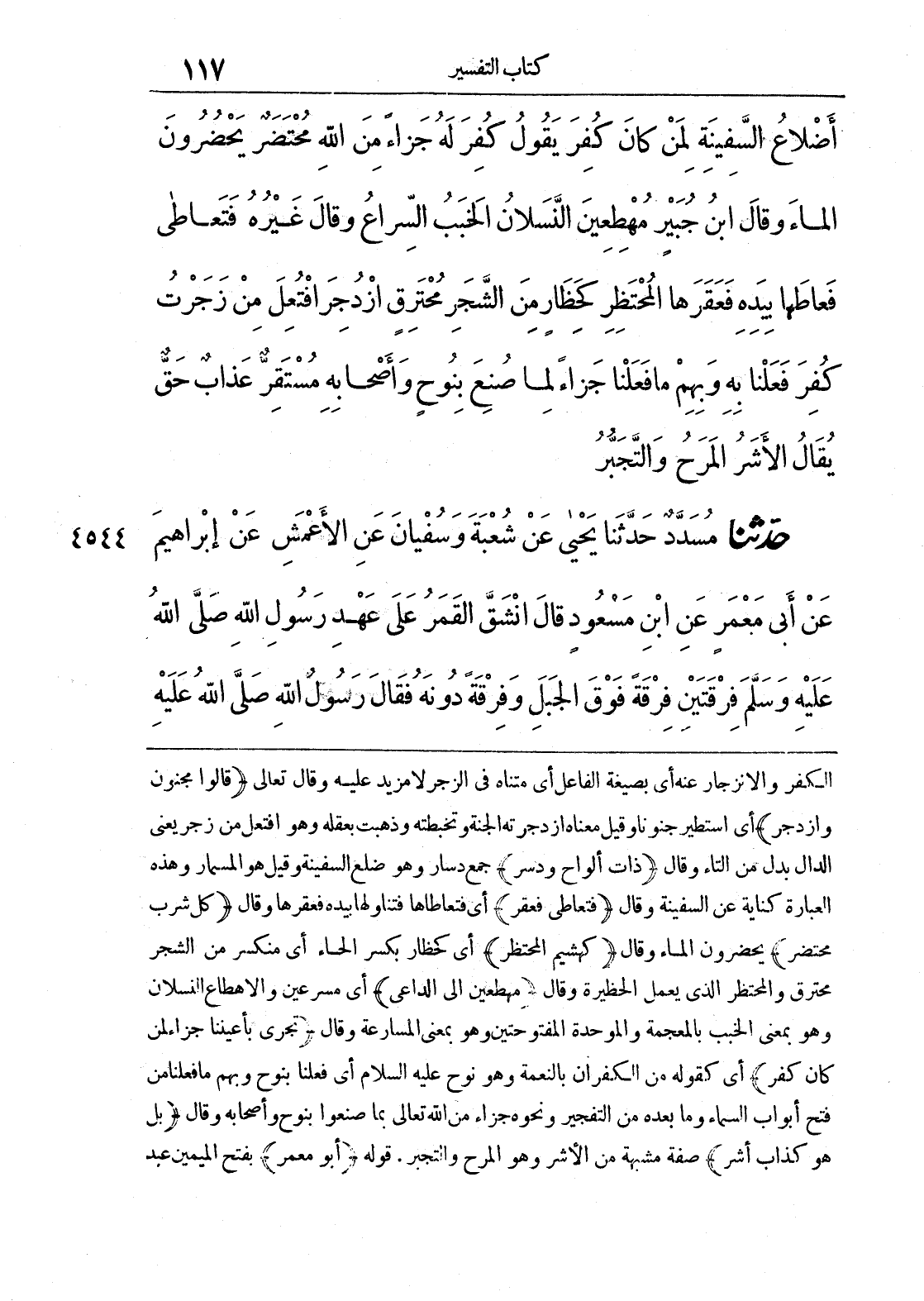 4544 - حَدَّثَنَا مُسَدَّدٌ حَدَّثَنَا يَحْيَى عَنْ شُعْبَةَ وَسُفْيَانَ عَنْ الْأَعْمَشِ عَنْ إِبْرَاهِيمَ عَنْ أَبِي مَعْمَرٍ عَنْ ابْنِ مَسْعُودٍ قَالَ انْشَقَّ الْقَمَرُ عَلَى عَهْدِ رَسُولِ اللَّهِ صَلَّى اللَّهُ عَلَيْهِ وَسَلَّمَ فِرْقَتَيْنِ فِرْقَةً فَوْقَ الْجَبَلِ وَفِرْقَةً دُونَهُ فَقَالَ رَسُولُ اللَّهِ صَلَّى اللَّهُ عَلَيْهِ
