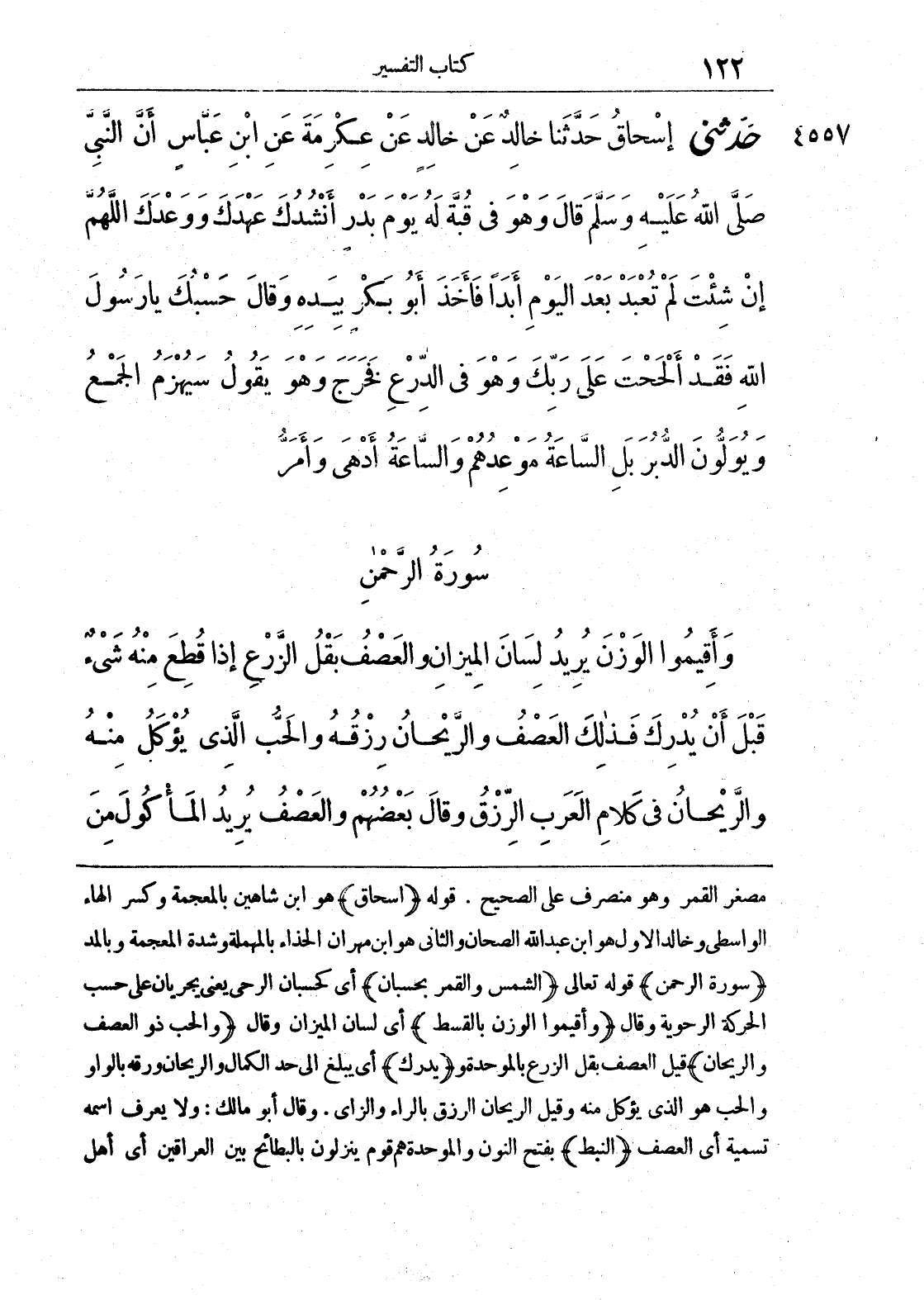 مصغر القمر وهو منصرف على الصحيح، قوله (إسحاق) هو ابن شاهين بالمعجمة وكسر الهاء الواسطى وخالد الأول هو ابن عبد الله الصحان والثاني هو ابن مهران الحذاء بالمهملة وشدة المعجمة وبالمد (سورة الرحمن) قوله تعالى (الشمس والقمر بحسبان) أي كحسبان الرحى يعني يجريان على حسب الحركة الرحوية وقال (وأقيموا الوزن بالقسط) أي لسان الميزان وقال (والحب ذو العصف والريحان) وقيل العصف بقل الزرع بالموحدة و (يدرك) أي يبلغ إلى حد الكمال والريحان ورقه بالواو والحب هو الذي يؤكل منه وقيل الريحان الرزق بالراء والزاي. وقال أبو مالك: ولا يعرف اسمه تسمية أي العصف (النبط) بفتح النون والموحدة هم قوم ينزلون بالبطائح بين العراقين أي أهل
