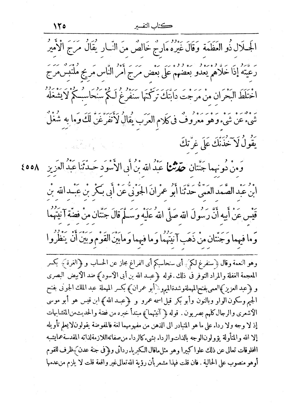 وهو النعمة وقال (سنفرغ لكم) أي سنحاسبكم أي الفراغ مجاز عن الحساب و (الغرة) بكسر المعجمة الغفلة والمراد التوفر في ذلك. قوله (عبد الله بن أبي الأسود) ضد الأبيض البصري و (عبد العزيز) العمى بفتح المهمة وشدة الميم و (أبو عمران) بكسر المهملة عبد الملك الجوني بفتح الجيم وسكون الواو وبالنون وأبو بكر قيل اسمه عمرو و (عبد الله) ابن قيس هو أبو موسى الأشعري والرجال كلهم بصريون. قوله (آنيتهما) مبتدأ خبره من فضة والحديث من المتشابهات إذ لا وجه ولا رداء على ما هو المتبادر إلى الذهن من مفهومها لغة فالمفوضة يقولون لا يعلم تأويله إلا الله والمتأولة يؤولون الوجه بالذات والرداء بشيء كالرداء من صفاته اللازمة لذاته المقدسة عما يشبه المخلوقات تعالى عن ذلك علواً كبيراً وهو مثل ما قال الكبرياء ردائي و (في جنة عدن) ظرف للقوم أو هو منصوب على الحالية، فإن قلت فهذا مشعر بأن رؤية مشعر بأن رؤية الله تعالى غير واقعة قلت لا يلزم من عدمها