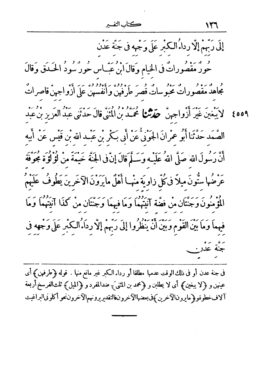 في جنة عدن أو في ذلك الوقت عدمها مطلقاً أو رداء الكبر غير مانع منها، قوله (طرفهن) أي عينهن و (لا يبغين) أي لا يطلبن و (محمد بن المثنى) ضد المفرد و (الميل) ثلث الفرسخ أربعة آلاف خطوة و (ما يرون الآخرين) في بعضها الآخرون فالتقدير يرونهم الآخرون نحو أكلوني البراغيث