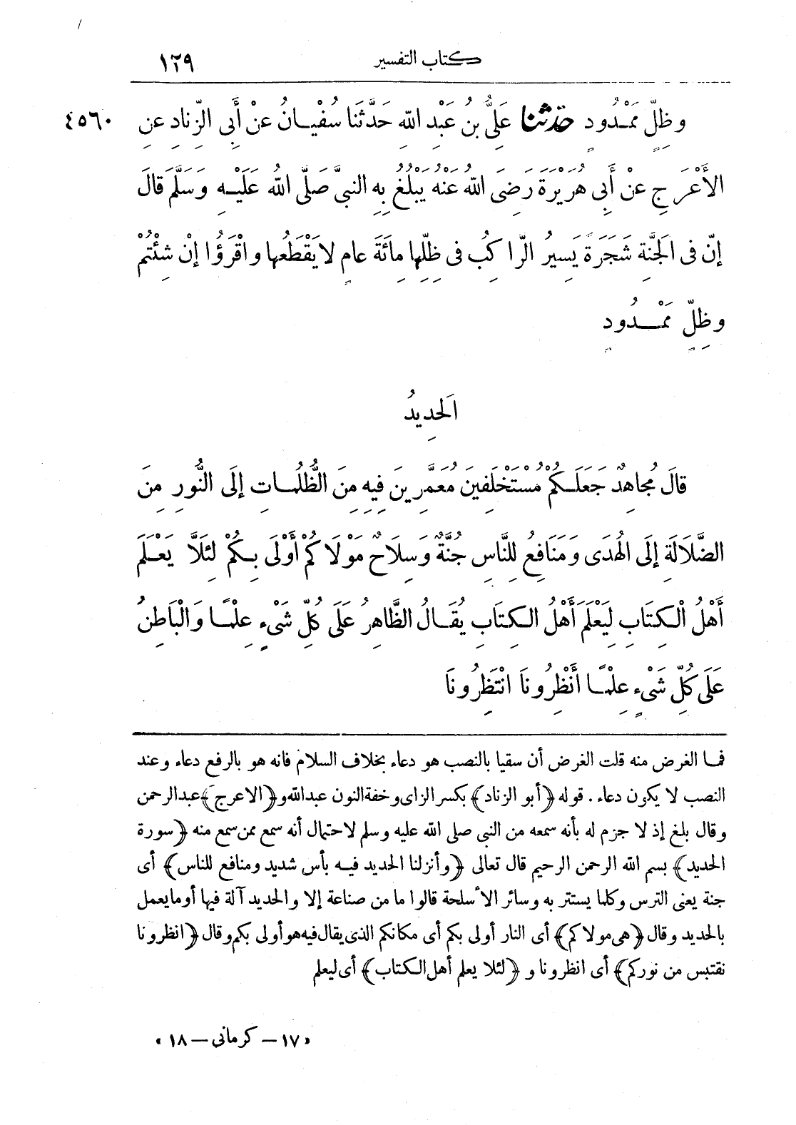فما الغرض منه قلت الغرض أن سقيا بالنصب هو دعاء بخلاف السلام فإنه هو بالرفع دعاء وعند النصب لا يكون دعاء، قوله (أبو الزناد) بكسر الزاي وخفة النون عبد الله و (الأعرج) عبد الرحمن وقال بلغ إذ لا جرم له بأنه سمعه من النبي صلى الله عليه وسلم لاحتمال أنه سمع ممن سمع منه (سورة الحديد) بسم الله الرحمن الرحيم قال تعالى (وأنزلنا الحديد فيه بأس شديد ومنافع للناس) أي جنة يعني الترس وكلما يستتر به وسائر الأسلحة قالوا ما من صناعة إلا والحديد آلة فيها أو ما يعمل بالحديد وقال (هي مولاكم) أي النار أولى بكم أي مكانكم الذي يقال فيه هو أولى بكم وقال (انظرونا نقتبس من نوركم) أي انظرونا و (لئلا يعلم أهل الكتاب) أي ليعلم