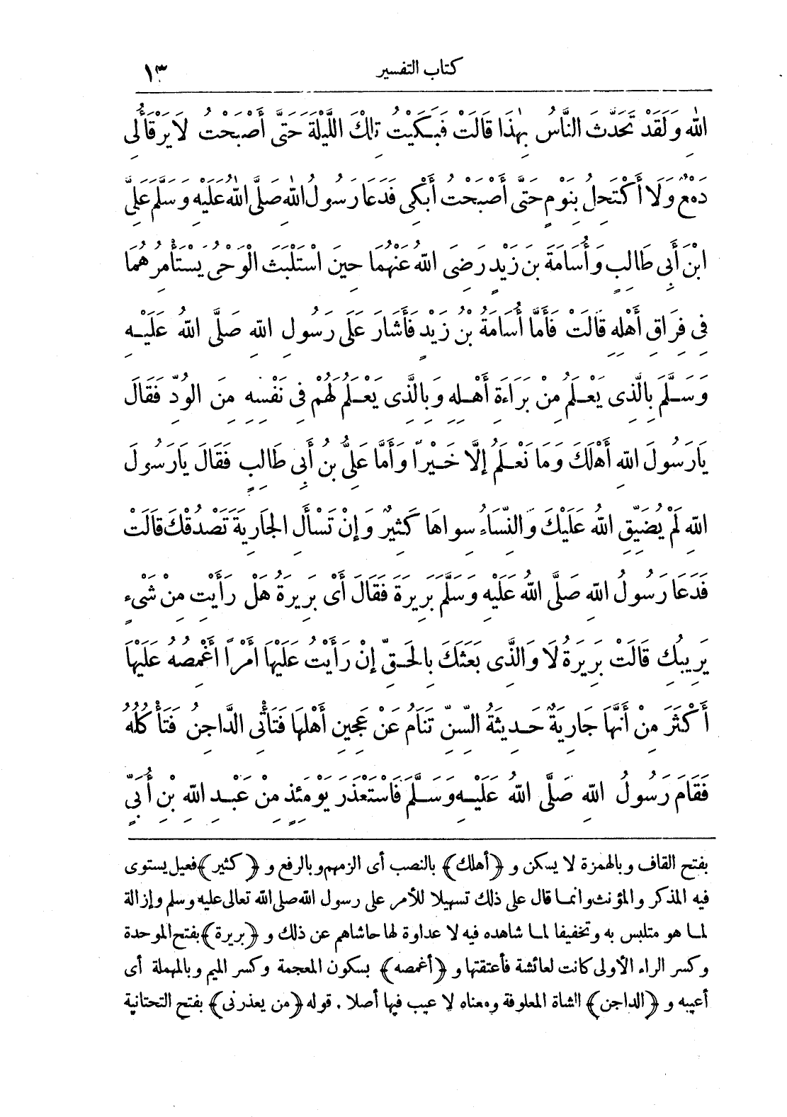 اللَّهِ وَلَقَدْ تَحَدَّثَ النَّاسُ بِهَذَا قَالَتْ فَبَكَيْتُ تِلْكَ اللَّيْلَةَ حَتَّى أَصْبَحْتُ لَا يَرْقَأُ لِي دَمْعٌ وَلَا أَكْتَحِلُ بِنَوْمٍ حَتَّى أَصْبَحْتُ أَبْكِي فَدَعَا رَسُولُ اللَّهِ صَلَّى اللَّهُ عَلَيْهِ وَسَلَّمَ عَلِيَّ بْنَ أَبِي طَالِبٍ وَأُسَامَةَ بْنَ زَيْدٍ رَضِيَ اللَّهُ عَنْهُمَا حِينَ اسْتَلْبَثَ الْوَحْيُ يَسْتَامِرُهُمَا فِي فِرَاقِ أَهْلِهِ قَالَتْ فَأَمَّا أُسَامَةُ بْنُ زَيْدٍ فَأَشَارَ عَلَى رَسُولِ اللَّهِ صَلَّى اللَّهُ عَلَيْهِ وَسَلَّمَ بِالَّذِي يَعْلَمُ مِنْ بَرَاءَةِ أَهْلِهِ وَبِالَّذِي يَعْلَمُ لَهُمْ فِي نَفْسِهِ مِنْ الْوُدِّ فَقَالَ يَا رَسُولَ اللَّهِ أَهْلَكَ وَلَا نَعْلَمُ إِلَّا خَيْرًا وَأَمَّا عَلِيُّ بْنُ أَبِي طَالِبٍ فَقَالَ يَا رَسُولَ اللَّهِ لَمْ يُضَيِّقْ اللَّهُ عَلَيْكَ وَالنِّسَاءُ سِوَاهَا كَثِيرٌ وَإِنْ تَسْأَلْ الْجَارِيَةَ تَصْدُقْكَ قَالَتْ فَدَعَا رَسُولُ اللَّهِ صَلَّى اللَّهُ عَلَيْهِ وَسَلَّمَ بَرِيرَةَ فَقَالَ أَيْ بَرِيرَةُ هَلْ رَأَيْتِ مِنْ شَيْءٍ يَرِيبُكِ قَالَتْ بَرِيرَةُ لَا وَالَّذِي بَعَثَكَ بِالْحَقِّ إِنْ رَأَيْتُ عَلَيْهَا أَمْرًا أَغْمِصُهُ عَلَيْهَا أَكْثَرَ مِنْ أَنَّهَا جَارِيَةٌ حَدِيثَةُ السِّنِّ تَنَامُ عَنْ عَجِينِ أَهْلِهَا فَتَاتِي الدَّاجِنُ فَتَاكُلُهُ فَقَامَ رَسُولُ اللَّهِ صَلَّى اللَّهُ عَلَيْهِ وَسَلَّمَ فَاسْتَعْذَرَ يَوْمَئِذٍ مِنْ عَبْدِ اللَّهِ بْنِ أُبَيٍّ