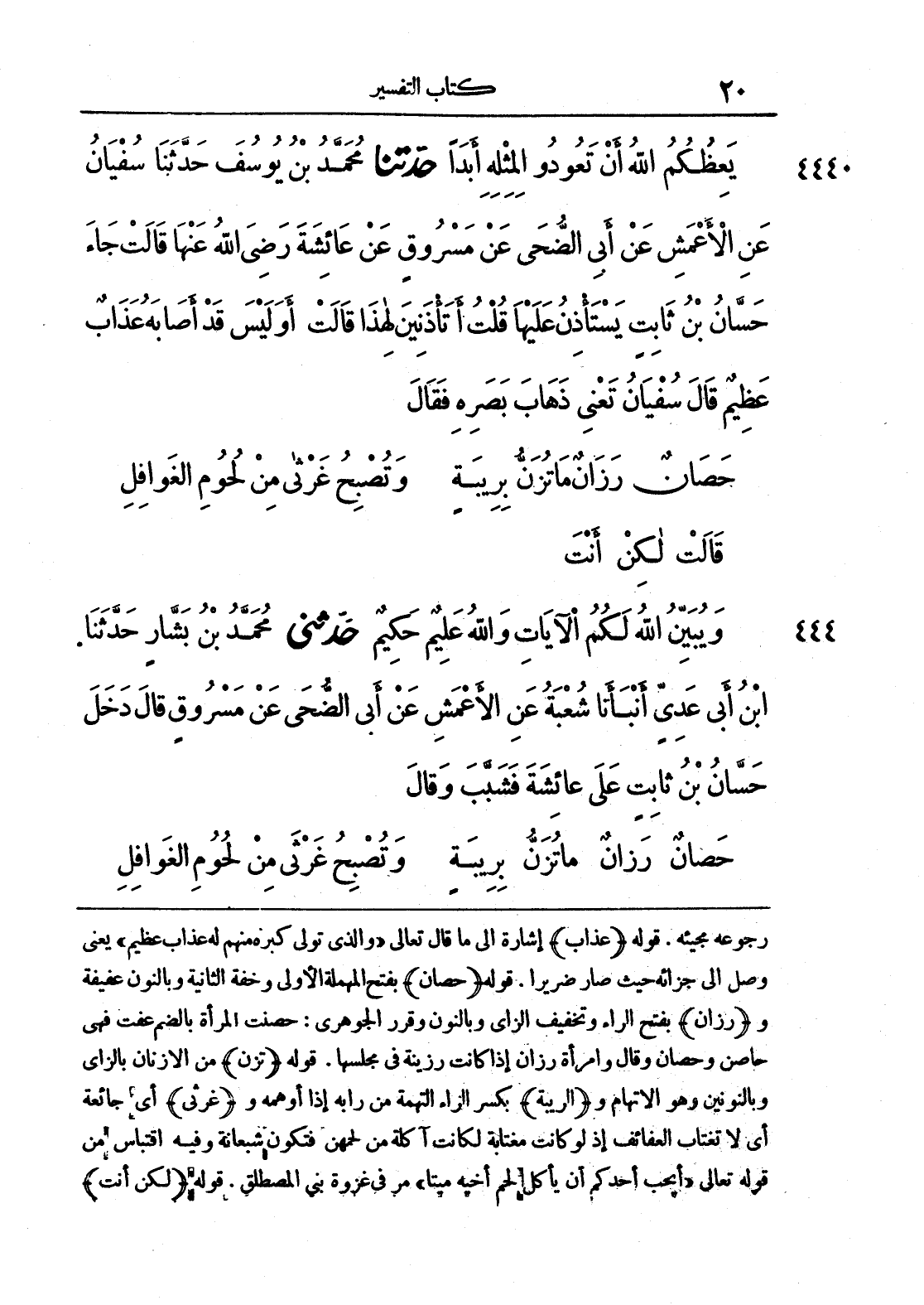 4441 - حَدَّثَنِي مُحَمَّدُ بْنُ بَشَّارٍ حَدَّثَنَا ابْنُ أَبِي عَدِيٍّ أَنْبَأَنَا شُعْبَةُ عَنْ الْأَعْمَشِ عَنْ أَبِي الضُّحَى عَنْ مَسْرُوقٍ قَالَ دَخَلَ حَسَّانُ بْنُ ثَابِتٍ عَلَى عَائِشَةَ فَشَبَّبَ