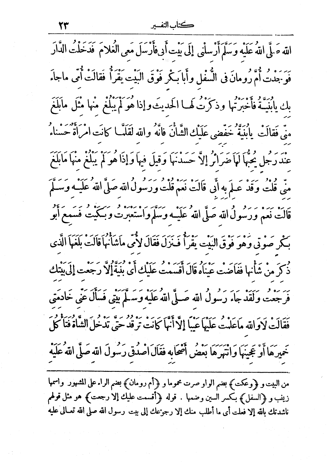 اللَّهِ صَلَّى اللَّهُ عَلَيْهِ وَسَلَّمَ أَرْسِلْنِي إِلَى بَيْتِ أَبِي فَأَرْسَلَ مَعِي الْغُلَامَ فَدَخَلْتُ الدَّارَ فَوَجَدْتُ أُمَّ رُومَانَ فِي السُّفْلِ وَأَبَا بَكْرٍ فَوْقَ الْبَيْتِ يَقْرَأُ فَقَالَتْ أُمِّي مَا جَاءَ بِكِ يَا بُنَيَّةُ فَأَخْبَرْتُهَا وَذَكَرْتُ لَهَا الْحَدِيثَ وَإِذَا هُوَ لَمْ يَبْلُغْ مِنْهَا مِثْلَ مَا بَلَغَ مِنِّي فَقَالَتْ يَا بُنَيَّةُ خَفِّفِي عَلَيْكِ الشَّانَ فَإِنَّهُ وَاللَّهِ لَقَلَّمَا كَانَتْ امْرَأَةٌ حَسْنَاءُ عِنْدَ رَجُلٍ يُحِبُّهَا لَهَا ضَرَائِرُ إِلَّا حَسَدْنَهَا وَقِيلَ فِيهَا وَإِذَا هُوَ لَمْ يَبْلُغْ مِنْهَا مَا بَلَغَ مِنِّي قُلْتُ وَقَدْ عَلِمَ بِهِ أَبِي قَالَتْ نَعَمْ قُلْتُ وَرَسُولُ اللَّهِ صَلَّى اللَّهُ عَلَيْهِ وَسَلَّمَ قَالَتْ نَعَمْ وَرَسُولُ اللَّهِ صَلَّى اللَّهُ عَلَيْهِ وَسَلَّمَ وَاسْتَعْبَرْتُ وَبَكَيْتُ فَسَمِعَ أَبُو بَكْرٍ صَوْتِي وَهُوَ فَوْقَ الْبَيْتِ يَقْرَأُ فَنَزَلَ فَقَالَ لِأُمِّي مَا شَانُهَا قَالَتْ بَلَغَهَا الَّذِي ذُكِرَ مِنْ شَانِهَا فَفَاضَتْ عَيْنَاهُ قَالَ أَقْسَمْتُ عَلَيْكِ أَيْ بُنَيَّةُ إِلَّا رَجَعْتِ إِلَى بَيْتِكِ فَرَجَعْتُ وَلَقَدْ جَاءَ رَسُولُ اللَّهِ صَلَّى اللَّهُ عَلَيْهِ وَسَلَّمَ بَيْتِي فَسَأَلَ عَنِّي خَادِمَتِي فَقَالَتْ لَا وَاللَّهِ مَا عَلِمْتُ عَلَيْهَا عَيْبًا إِلَّا أَنَّهَا كَانَتْ تَرْقُدُ حَتَّى تَدْخُلَ الشَّاةُ فَتَاكُلَ خَمِيرَهَا أَوْ عَجِينَهَا وَانْتَهَرَهَا بَعْضُ أَصْحَابِهِ فَقَالَ اصْدُقِي رَسُولَ اللَّهِ صَلَّى اللَّهُ عَلَيْهِ