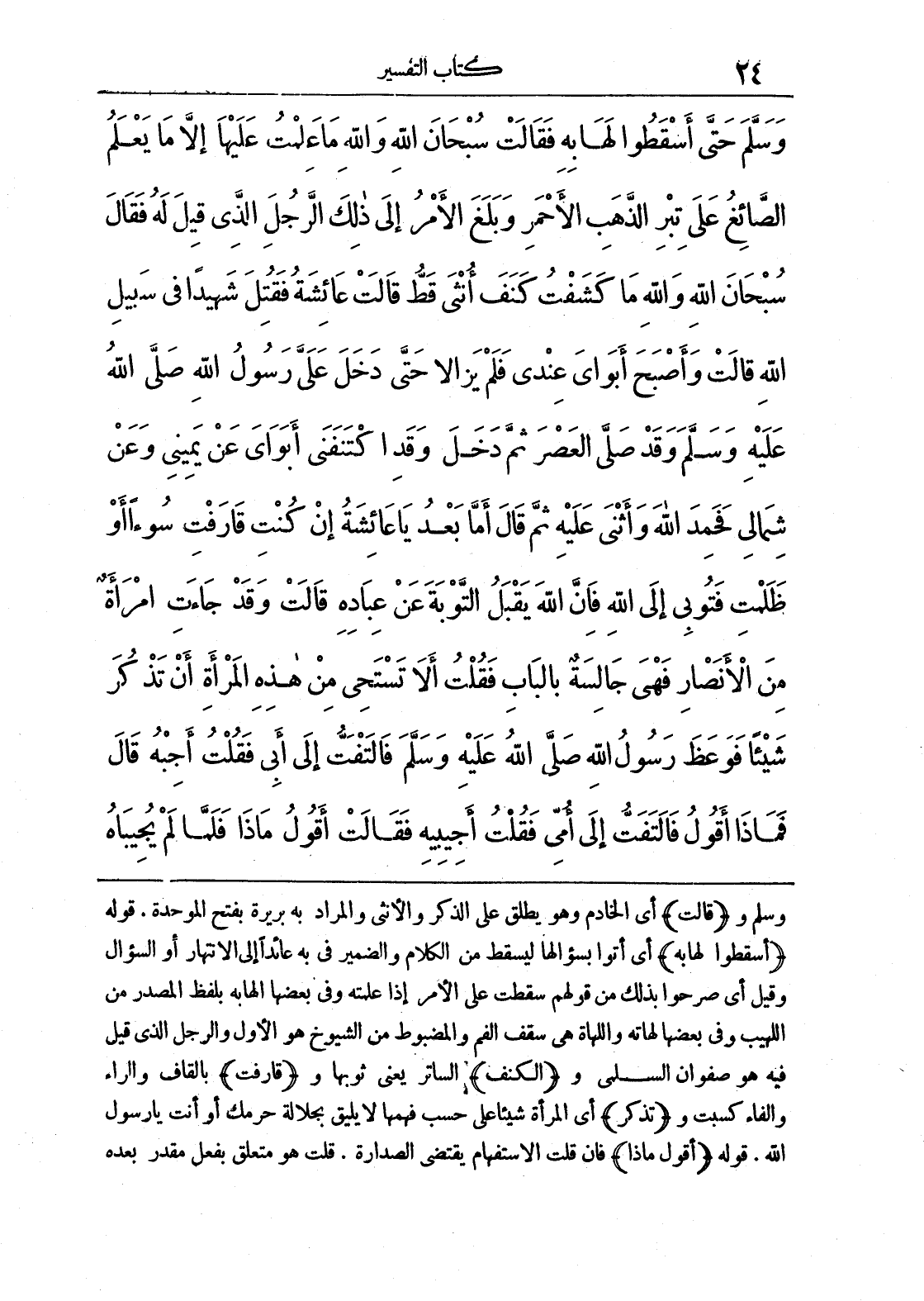 وَسَلَّمَ حَتَّى أَسْقَطُوا لَهَا بِهِ فَقَالَتْ سُبْحَانَ اللَّهِ وَاللَّهِ مَا عَلِمْتُ عَلَيْهَا إِلَّا مَا يَعْلَمُ الصَّائِغُ عَلَى تِبْرِ الذَّهَبِ الْأَحْمَرِ وَبَلَغَ الْأَمْرُ إِلَى ذَلِكَ الرَّجُلِ الَّذِي قِيلَ لَهُ فَقَالَ سُبْحَانَ اللَّهِ وَاللَّهِ مَا كَشَفْتُ كَنَفَ أُنْثَى قَطُّ قَالَتْ عَائِشَةُ فَقُتِلَ شَهِيدًا فِي سَبِيلِ اللَّهِ قَالَتْ وَأَصْبَحَ أَبَوَايَ عِنْدِي فَلَمْ يَزَالَا حَتَّى دَخَلَ عَلَيَّ رَسُولُ اللَّهِ صَلَّى اللَّهُ عَلَيْهِ وَسَلَّمَ وَقَدْ صَلَّى الْعَصْرَ ثُمَّ دَخَلَ وَقَدْ اكْتَنَفَنِي أَبَوَايَ عَنْ يَمِينِي وَعَنْ شِمَالِي فَحَمِدَ اللَّهَ وَأَثْنَى عَلَيْهِ ثُمَّ قَالَ أَمَّا بَعْدُ يَا عَائِشَةُ إِنْ كُنْتِ قَارَفْتِ سُوءًا أَوْ ظَلَمْتِ فَتُوبِي إِلَى اللَّهِ فَإِنَّ اللَّهَ يَقْبَلُ التَّوْبَةَ مِنْ عِبَادِهِ قَالَتْ وَقَدْ جَاءَتْ امْرَأَةٌ مِنْ الْأَنْصَارِ فَهِيَ جَالِسَةٌ بِالْبَابِ فَقُلْتُ أَلَا تَسْتَحْيِ مِنْ هَذِهِ الْمَرْأَةِ أَنْ تَذْكُرَ شَيْئًا فَوَعَظَ رَسُولُ اللَّهِ صَلَّى اللَّهُ عَلَيْهِ وَسَلَّمَ فَالْتَفَتُّ إِلَى أَبِي فَقُلْتُ لَهُ أَجِبْهُ قَالَ فَمَاذَا أَقُولُ فَالْتَفَتُّ إِلَى أُمِّي فَقُلْتُ أَجِيبِيهِ فَقَالَتْ أَقُولُ مَاذَا فَلَمَّا لَمْ يُجِيبَاهُ