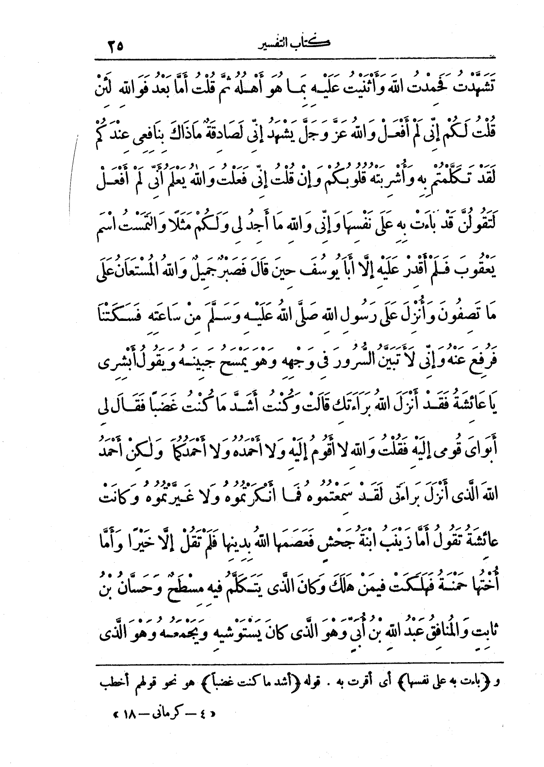 تَشَهَّدْتُ فَحَمِدْتُ اللَّهَ وَأَثْنَيْتُ عَلَيْهِ بِمَا هُوَ أَهْلُهُ ثُمَّ قُلْتُ أَمَّا بَعْدُ فَوَاللَّهِ لَئِنْ قُلْتُ لَكُمْ إِنِّي لَمْ أَفْعَلْ وَاللَّهُ عَزَّ وَجَلَّ يَشْهَدُ إِنِّي لَصَادِقَةٌ مَا ذَاكَ بِنَافِعِي عِنْدَكُمْ لَقَدْ تَكَلَّمْتُمْ بِهِ وَأُشْرِبَتْهُ قُلُوبُكُمْ وَإِنْ قُلْتُ إِنِّي قَدْ فَعَلْتُ وَاللَّهُ يَعْلَمُ أَنِّي لَمْ أَفْعَلْ لَتَقُولُنَّ قَدْ بَاءَتْ بِهِ عَلَى نَفْسِهَا وَإِنِّي وَاللَّهِ مَا أَجِدُ لِي وَلَكُمْ مَثَلًا وَالْتَمَسْتُ اسْمَ يَعْقُوبَ فَلَمْ أَقْدِرْ عَلَيْهِ إِلَّا أَبَا يُوسُفَ حِينَ قَالَ {فَصَبْرٌ جَمِيلٌ وَاللَّهُ الْمُسْتَعَانُ عَلَى مَا تَصِفُونَ} وَأُنْزِلَ عَلَى رَسُولِ اللَّهِ صَلَّى اللَّهُ عَلَيْهِ وَسَلَّمَ مِنْ سَاعَتِهِ فَسَكَتْنَا فَرُفِعَ عَنْهُ وَإِنِّي لَأَتَبَيَّنُ السُّرُورَ فِي وَجْهِهِ وَهُوَ يَمْسَحُ جَبِينَهُ وَيَقُولُ أَبْشِرِي يَا عَائِشَةُ فَقَدْ أَنْزَلَ اللَّهُ بَرَاءَتَكِ قَالَتْ وَكُنْتُ أَشَدَّ مَا كُنْتُ غَضَبًا فَقَالَ لِي أَبَوَايَ قُومِي إِلَيْهِ فَقُلْتُ لَا وَاللَّهِ لَا أَقُومُ إِلَيْهِ وَلَا أَحْمَدُهُ وَلَا أَحْمَدُكُمَا وَلَكِنْ أَحْمَدُ اللَّهَ الَّذِي أَنْزَلَ بَرَاءَتِي لَقَدْ سَمِعْتُمُوهُ فَمَا أَنْكَرْتُمُوهُ وَلَا غَيَّرْتُمُوهُ وَكَانَتْ عَائِشَةُ تَقُولُ أَمَّا زَيْنَبُ ابْنَةُ جَحْشٍ فَعَصَمَهَا اللَّهُ بِدِينِهَا فَلَمْ تَقُلْ إِلَّا خَيْرًا وَأَمَّا أُخْتُهَا حَمْنَةُ فَهَلَكَتْ فِيمَنْ هَلَكَ وَكَانَ الَّذِي يَتَكَلَّمُ فِيهِ مِسْطَحٌ وَحَسَّانُ بْنُ ثَابِتٍ وَالْمُنَافِقُ عَبْدُ اللَّهِ بْنُ أُبَيٍّ وَهُوَ الَّذِي كَانَ يَسْتَوْشِيهِ وَيَجْمَعُهُ وَهُوَ الَّذِي
