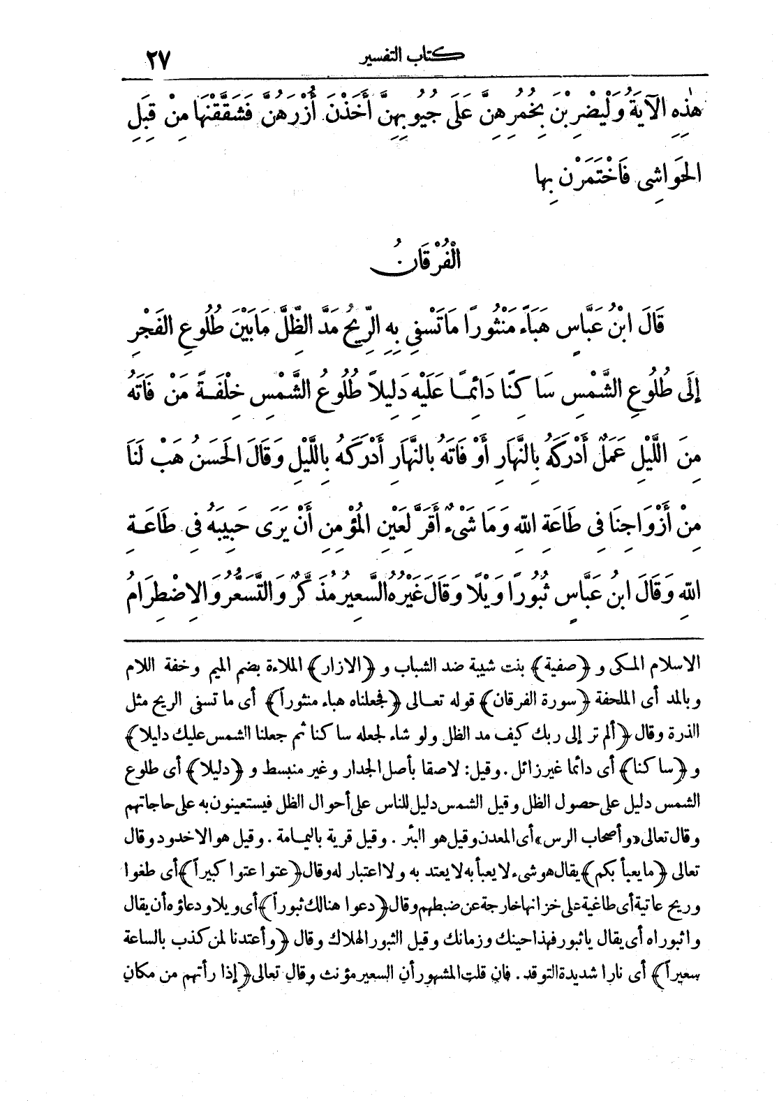 الإسلام المكي و (صفية) بنت شيبة ضد الشباب و (الإزار) الملاءة بضم الميم وخفة اللام وبالمد أي الملحفة (سورة الفرقان) قوله تعالى (فجعلناه هباء منثوراً) أي ما تسفي الريح مثل الذرة وقال (ألم تر إلى ربك كيف مد الظل ولو شاء لجعله ساكناً ثم جعلنا الشمس عليك دليلاً) و (ساكناً) أي دائماً غير زائل. وقيل: لاصقاً بأصل الجدار وغير منبسط و (دليلاً) أي طلوع الشمس دليل على حصول الظل وقيل الشمس دليل للناس على أحوال الظل فيستعينون به على حاجاتهم وقال تعالى «وأصحاب الرس» أي المعدن وقيل هو البئر. وقيل قرية باليمامة. وقيل هو الأخدود وقال تعالى (ما يعبأ بكم) يقال هو شيء لا يعبأ به لا يعتد به ولا اعتبار له وقال (عتوا عتوا كبيراً) أي طغوا وريح عاتية أي طاغية على خزانها خارجة عن ضبطهم وقال (دعوا هنالك ثبوراً) أي ويلا ودعاؤه أن يقال واثبوراه أي يقال يا ثبور فهاذ حينك وزمانك وقيل الثبور الهلاك وقال (وأعتدنا لمن كذب بالساعة سعيراً) أي ناراً شديدة التوقد، فإن قلت المشهور أن السعير مؤنث وقال تعالى (إذا رأتهم من مكان