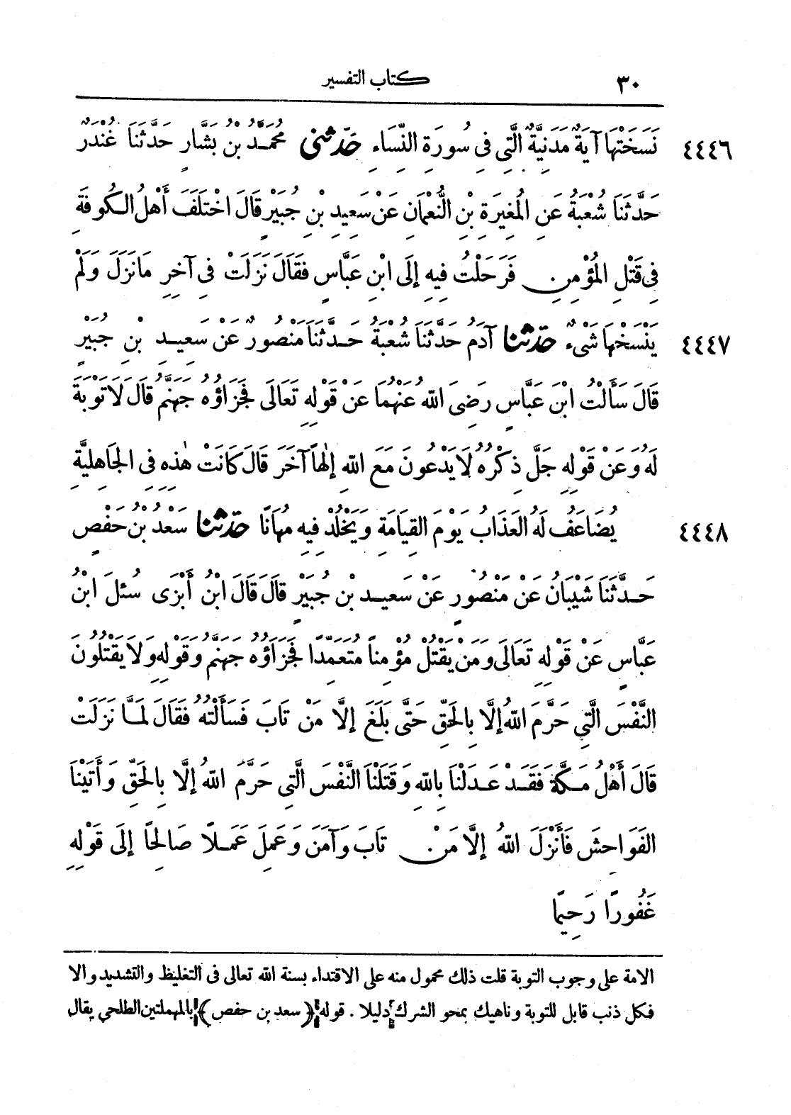 4448 - حَدَّثَنَا سَعْدُ بْنُ حَفْصٍ حَدَّثَنَا شَيْبَانُ عَنْ مَنْصُورٍ عَنْ سَعِيدِ بْنِ جُبَيْرٍ قَالَ قَالَ ابْنُ أَبْزَى سَلْ ابْنَ عَبَّاسٍ عَنْ قَوْلِهِ تَعَالَى {وَمَنْ يَقْتُلْ مُؤْمِنًا مُتَعَمِّدًا فَجَزَاؤُهُ جَهَنَّمُ خَالِدًا فِيهَا} وَقَوْلِهِ {وَلَا يَقْتُلُونَ النَّفْسَ الَّتِي حَرَّمَ اللَّهُ إِلَّا بِالْحَقِّ حَتَّى بَلَغَ إِلَّا مَنْ تَابَ وَآمَنَ} فَسَأَلْتُهُ فَقَالَ لَمَّا نَزَلَتْ قَالَ أَهْلُ مَكَّةَ فَقَدْ عَدَلْنَا بِاللَّهِ وَقَدْ قَتَلْنَا النَّفْسَ الَّتِي حَرَّمَ اللَّهُ إِلَّا بِالْحَقِّ وَأَتَيْنَا الْفَوَاحِشَ فَأَنْزَلَ اللَّهُ {إِلَّا مَنْ تَابَ وَآمَنَ وَعَمِلَ عَمَلًا صَالِحًا إِلَى قَوْلِهِ غَفُورًا رَحِيمًا}