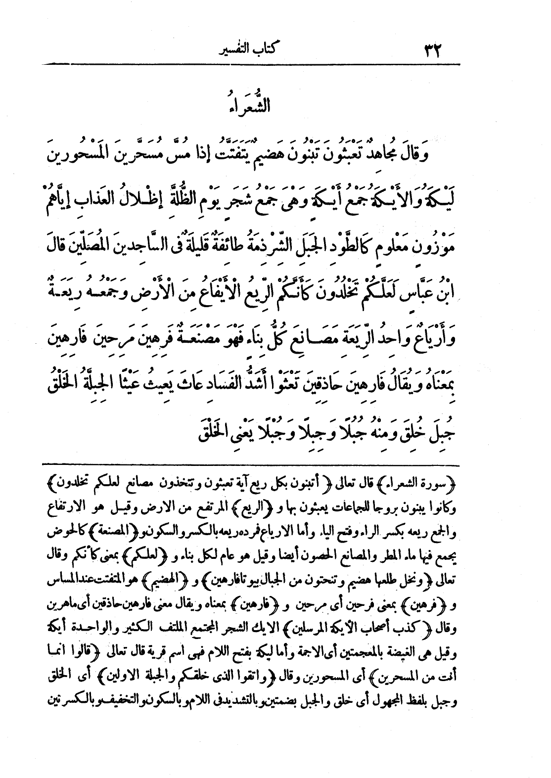 (سورة الشعراء) قال تعالى (أبنون بكل ريع آية تعبثون وتتخذون مصانع لعلكم تخلدون) وكانوا يبنون بروجاً للجماعات يعبثون بها و (الريع) المرتفع من الأرض وقيل هو الارتفاع والجمع ريعه بكسر الراء وفتح الياء وأما الارياع فمرده ريعه بالكسر والسكون و (المصنعة) كالحوض يجمع فيها ماء المطر والمصانع الحصون أيضاً وقيل هو عام لكل بناء و (لعلكم) بمعنى كأنكم وقال تعالى (ونخل طلعها هضيم وتنحتون من الجبال بيوتاً فارهين) و (الهضيم) هو المتفتت عند المساس و (فرهين) بمعنى فرحين أي مرحين و (فارهين) بمعناه ويقال معنى فارهين حاذقين أي ماهرين وقال (كذب أصحاب الأيكة المرسلين) الأيك الشجر المجتمع الملتف الكثير والواحدة أيكة وقيل هي الغيضة بالمعجمتين أي الأجمة وأما ليكة بفتح اللام فهي اسم قرية قال تعالى (قالوا إنما أنت من المسحرين) أي المسحورين وقال (واتقوا الذي خلقكم والجبلة الأولين) أي الخلق وجبل بلفظ المجهول أي خلق والجبل بضمتين وبالتشديد في اللام وبالسكون والتخفيف وبالكسرتين