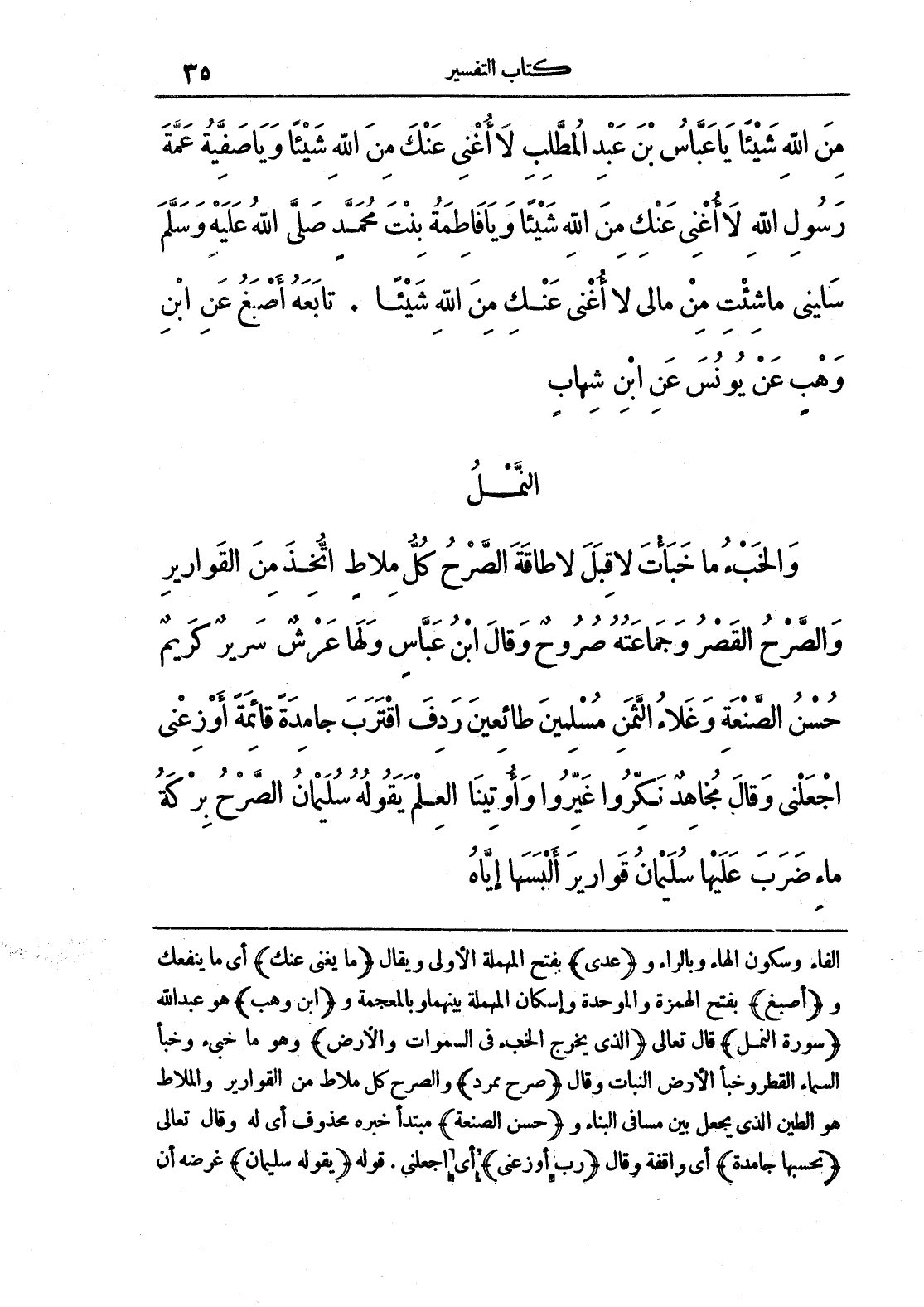 الفاء وسكون الهاء وبالراء و (عدى) بفتح المهملة الأولى ويقال (ما يغني عنك) أي ما ينفعك و (أصبغ) بفتح الهمزة والموحدة وإسكان المهملة وبالمعجمة و (ابن وهب) هو عبد الله (سورة النمل) قال تعالى (الذي يخرج الخبء في السموات والأرض) وهو ما خبئ وخبأ السماء القطر وخبأ الأرض النبات وقال (صرح ممرد) والصرح كل ملاط من القوارير والملاط هو الطين الذي يجعل بين مسافى البناء و (حسن الصنعة) مبتدأ خبره محذوف أي له قوال تعالى (تحسبها جامدة) أي واقفة وقال (رب أوزعني) أي أجعلني، قوله (يقوله سليمان) غرضه أن
