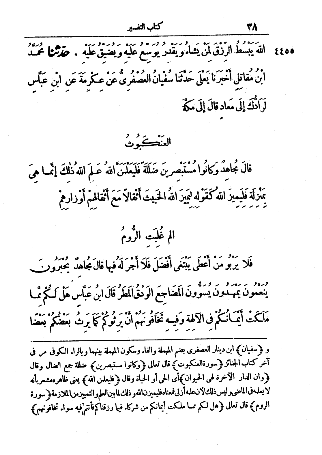 و (سفيان) ابن دينار العصفري بضم المهملة والفاء وسكون المهملة بينهما وبالراء الكوفي مر في آخر كتاب الجنائز (سورة العنكبوت) قال تعالى (وكانوا مستبصرين) ضللة جمع الضال وقال (وإن الدار الآخرة لهي الحيوان) أي الحي أو الحياة وقال (فليعلمن الله) يعني ظاهره مشعر بأنه لا يعلمه في الماضي وليس ذلك لأن علمه أزلي فمعناه فليميزن الله وذلك لما بين العلم والتمييز من الملازمة (سورة الروم) قال تعالى (هل لكم مما ملكت أيمانكم من شركاء فيما رزقناكم فأنتم فيه سواء تخافونهم)