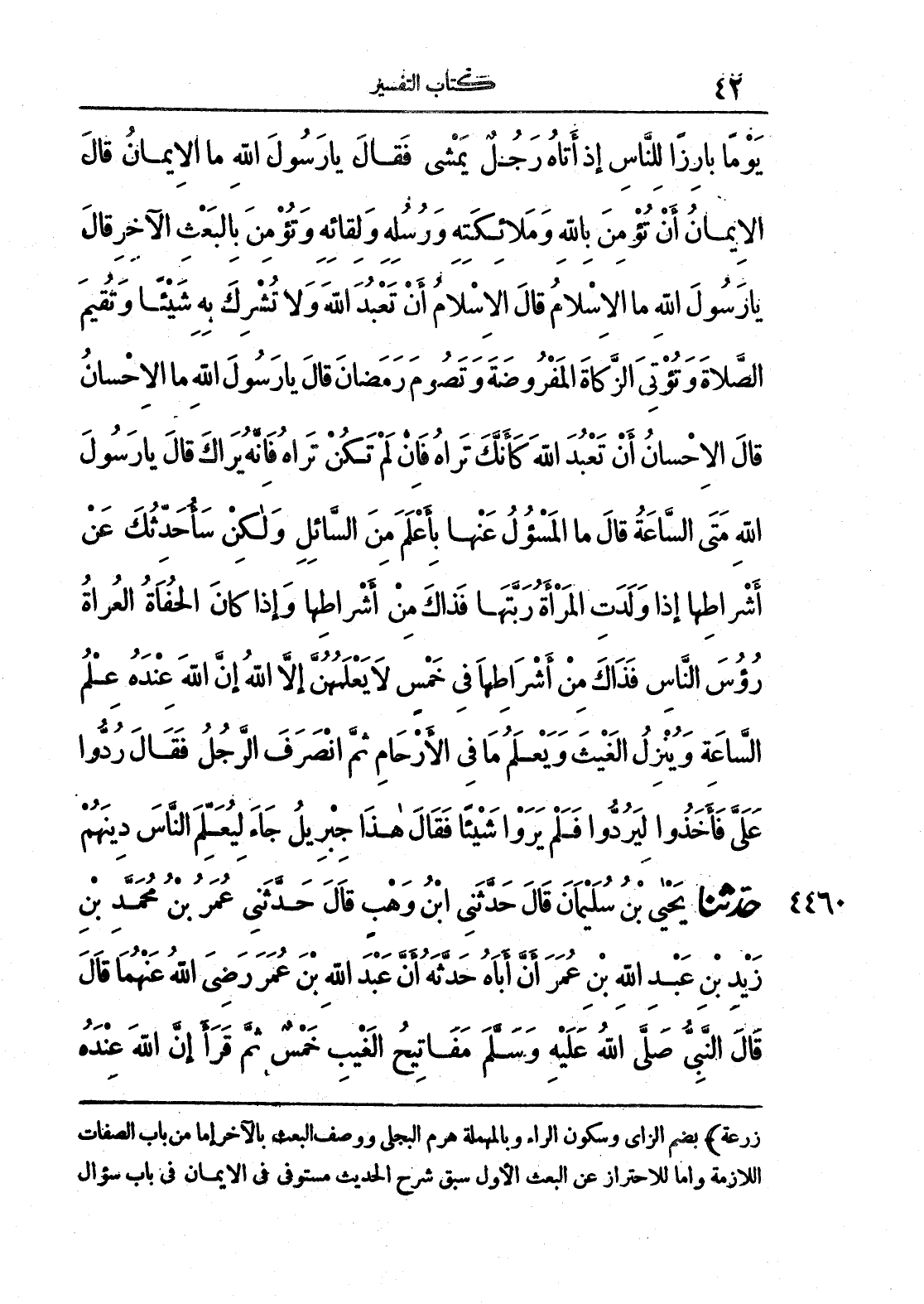 يَوْمًا بَارِزًا لِلنَّاسِ إِذْ أَتَاهُ رَجُلٌ يَمْشِي فَقَالَ يَا رَسُولَ اللَّهِ مَا الْإِيمَانُ قَالَ الْإِيمَانُ أَنْ تُؤْمِنَ بِاللَّهِ وَمَلَائِكَتِهِ وَكُتُبِهِ وَرُسُلِهِ وَلِقَائِهِ وَتُؤْمِنَ بِالْبَعْثِ الْآخِرِ قَالَ يَا رَسُولَ اللَّهِ مَا الْإِسْلَامُ قَالَ الْإِسْلَامُ أَنْ تَعْبُدَ اللَّهَ وَلَا تُشْرِكَ بِهِ شَيْئًا وَتُقِيمَ الصَّلَاةَ وَتُؤْتِيَ الزَّكَاةَ الْمَفْرُوضَةَ وَتَصُومَ رَمَضَانَ قَالَ يَا رَسُولَ اللَّهِ مَا الْإِحْسَانُ قَالَ الْإِحْسَانُ أَنْ تَعْبُدَ اللَّهَ كَأَنَّكَ تَرَاهُ فَإِنْ لَمْ تَكُنْ تَرَاهُ فَإِنَّهُ يَرَاكَ قَالَ يَا رَسُولَ اللَّهِ مَتَى السَّاعَةُ قَالَ مَا الْمَسْئُولُ عَنْهَا بِأَعْلَمَ مِنْ السَّائِلِ وَلَكِنْ سَأُحَدِّثُكَ عَنْ أَشْرَاطِهَا إِذَا وَلَدَتْ الْمَرْأَةُ رَبَّتَهَا فَذَاكَ مِنْ أَشْرَاطِهَا وَإِذَا كَانَ الْحُفَاةُ الْعُرَاةُ رُءُوسَ النَّاسِ فَذَاكَ مِنْ أَشْرَاطِهَا فِي خَمْسٍ لَا يَعْلَمُهُنَّ إِلَّا اللَّهُ {إِنَّ اللَّهَ عِنْدَهُ عِلْمُ السَّاعَةِ وَيُنْزِلُ الْغَيْثَ وَيَعْلَمُ مَا فِي الْأَرْحَامِ} ثُمَّ انْصَرَفَ الرَّجُلُ فَقَالَ رُدُّوا عَلَيَّ فَأَخَذُوا لِيَرُدُّوا فَلَمْ يَرَوْا شَيْئًا فَقَالَ هَذَا جِبْرِيلُ جَاءَ لِيُعَلِّمَ النَّاسَ دِينَهُمْ